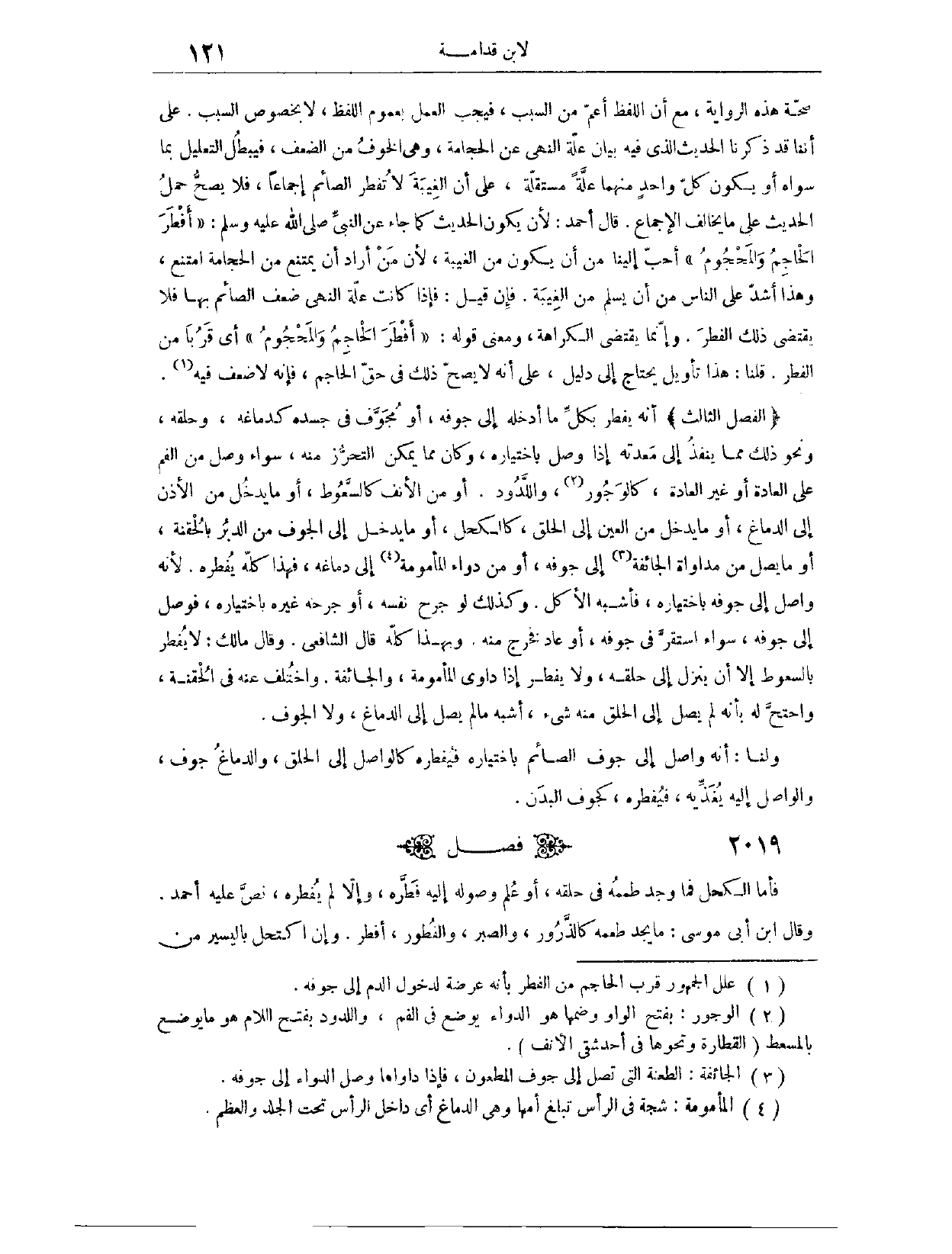 (٢٠٢٠) الْفَصْلُ الثَّالِثُ، أَنَّهُ يُفْطِرُ بِكُلِّ مَا أَدْخَلَهُ إلَى جَوْفِهِ، أَوْ مُجَوَّفٍ فِي جَسَدِهِ كَدِمَاغِهِ وَحَلْقِهِ، وَنَحْوِ ذَلِكَ مِمَّا يَنْفُذُ إلَى مَعِدَتِهِ، إذَا وَصَلَ بِاخْتِيَارِهِ، وَكَانَ مِمَّا يُمْكِنُ التَّحَرُّزُ مِنْهُ، سَوَاءٌ وَصَلَ مِنْ الْفَمِ عَلَى الْعَادَةِ، أَوْ غَيْرِ الْعَادَةِ كَالْوَجُورِ وَاللَّدُودِ، أَوْ مِنْ الْأَنْفِ كَالسَّعُوطِ، أَوْ مَا يَدْخُلُ مِنْ الْأُذُنِ إلَى الدِّمَاغِ، أَوْ مَا يَدْخُلُ مِنْ الْعَيْنِ إلَى الْحَلْقِ كَالْكُحْلِ، أَوْ مَا يَدْخُلُ إلَى الْجَوْفِ مِنْ الدُّبُرِ بِالْحُقْنَةِ، أَوْ مَا يَصِلُ مِنْ مُدَاوَاةِ الْجَائِفَةِ إلَى جَوْفِهِ، أَوْ مِنْ دَوَاءِ الْمَأْمُومَةِ إلَى دِمَاغِهِ، فَهَذَا كُلُّهُ يُفْطِرُهُ؛ لِأَنَّهُ وَاصِلٌ إلَى جَوْفِهِ بِاخْتِيَارِهِ، فَأَشْبَهَ الْأَكْلَ، وَكَذَلِكَ لَوْ جَرَحَ نَفْسَهُ، أَوْ جَرَحَهُ غَيْرُهُ بِاخْتِيَارِهِ، فَوَصَلَ إلَى جَوْفِهِ، سَوَاءٌ اسْتَقَرَّ فِي جَوْفِهِ، أَوْ عَادَ فَخَرَجَ مِنْهُ، وَبِهَذَا كُلِّهِ قَالَ الشَّافِعِيُّ. وَقَالَ مَالِكٌ: لَا يُفْطِرُ بِالسَّعُوطِ، إلَّا أَنْ يَنْزِلَ إلَى حَلْقِهِ، وَلَا يُفْطِرُ إذَا دَاوَى الْمَأْمُومَةَ وَالْجَائِفَةَ.