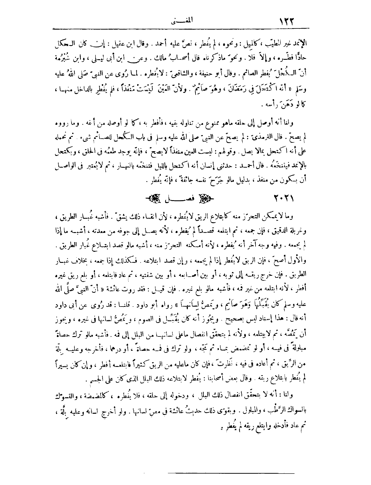 (٢٠٢٢) فَصْلٌ: وَمَا لَا يُمْكِنُ التَّحَرُّزُ مِنْهُ، كَابْتِلَاعِ الرِّيقِ لَا يُفَطِّرُهُ، لِأَنَّ اتِّقَاءَ ذَلِكَ يَشُقُّ، فَأَشْبَهَ غُبَارَ الطَّرِيقِ، وَغَرْبَلَةَ الدَّقِيقِ. فَإِنْ جَمَعَهُ ثُمَّ ابْتَلَعَهُ قَصْدًا لَمْ يُفَطِّرْهُ؛ لِأَنَّهُ يَصِلُ إلَى جَوْفِهِ مِنْ مَعِدَتِهِ، أَشْبَهَ مَا إذَا لَمْ يَجْمَعْهُ. وَفِيهِ وَجْهٌ آخَرُ، أَنَّهُ يُفَطِّرُهُ؛ لِأَنَّهُ أَمْكَنَهُ التَّحَرُّزُ مِنْهُ، أَشْبَهَ مَا لَوْ قَصَدَ ابْتِلَاعَ غُبَارِ الطَّرِيقِ. وَالْأَوَّلُ أَصَحُّ؛ فَإِنَّ الرِّيقَ لَا يُفَطِّرُ إذَا لَمْ يَجْمَعْهُ، وَإِنْ قَصَدَ ابْتِلَاعَهُ، فَكَذَلِكَ إذَا جَمَعَهُ، بِخِلَافِ غُبَارِ الطَّرِيقِ، فَإِنْ خَرَجَ رِيقُهُ إلَى ثَوْبِهِ، أَوْ بَيْنَ أَصَابِعِهِ، أَوْ بَيْنَ شَفَتَيْهِ، ثُمَّ عَادَ فَابْتَلَعَهُ، أَوْ بَلَعَ رِيقَ غَيْرِهِ، أَفْطَرَ؛ لِأَنَّهُ ابْتَلَعَهُ مِنْ غَيْرِ فَمِهِ، فَأَشْبَهَ مَا لَوْ بَلَعَ غَيْرَهُ. فَإِنْ قِيلَ: فَقَدْ رَوَتْ عَائِشَةُ، أَنَّ النَّبِيَّ - صَلَّى اللَّهُ عَلَيْهِ وَسَلَّمَ - «كَانَ يُقَبِّلُهَا وَهُوَ صَائِمٌ، وَيَمُصُّ لِسَانَهَا.» رَوَاهُ أَبُو دَاوُد. قُلْنَا: قَدْ رُوِيَ عَنْ أَبِي دَاوُد أَنَّهُ قَالَ: هَذَا إسْنَادٌ لَيْسَ بِصَحِيحٍ.