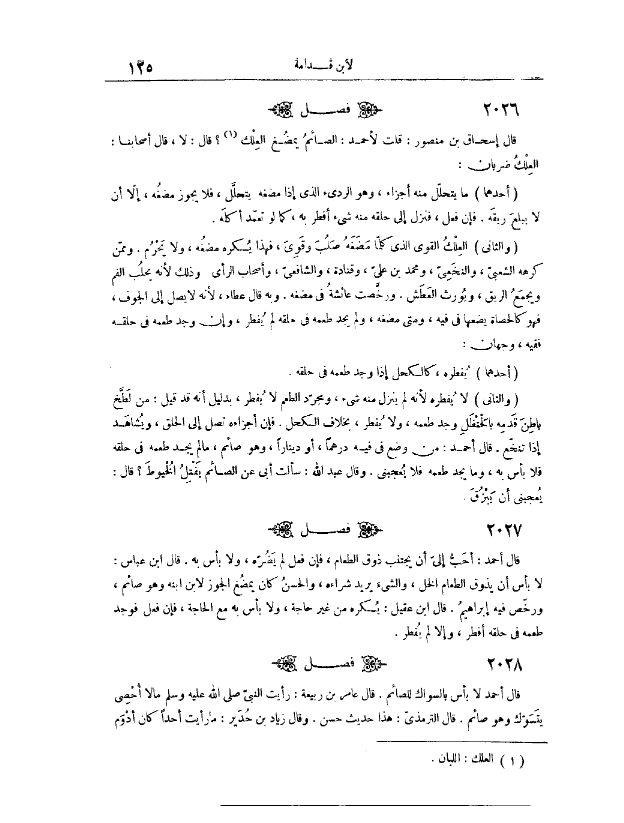 (٢٠٢٧) فَصْلٌ: قَالَ إِسْحَاقُ بْنُ مَنْصُورٍ: قُلْت لِأَحْمَدَ: الصَّائِمُ يَمْضُغُ الْعِلْكَ. قَالَ: لَا. قَالَ أَصْحَابُنَا: الْعِلْكُ ضَرْبَانِ؛ أَحَدُهُمَا، مَا يَتَحَلَّلُ مِنْهُ أَجْزَاءٌ، وَهُوَ الرَّدِيءُ الَّذِي إذَا مَضَغَهُ يَتَحَلَّلُ، فَلَا يَجُوزُ مَضْغُهُ، إلَّا أَنْ لَا يَبْلَعَ رِيقَهُ، فَإِنْ فَعَلَ فَنَزَلَ إلَى حَلْقِهِ مِنْهُ شَيْءٌ، أَفْطَرَ بِهِ، كَمَا لَوْ تَعَمَّدَ أَكْلَهُ. وَالثَّانِي، الْعِلْكُ الْقَوِيُّ الَّذِي كُلَّمَا مَضَغَهُ صَلُبَ وَقَوِيَ، فَهَذَا يُكْرَهُ مَضْغُهُ وَلَا يَحْرُمُ. وَمِمَّنْ كَرِهَهُ الشَّعْبِيُّ، وَالنَّخَعِيُّ وَمُحَمَّدُ بْنُ عَلِيٍّ وَقَتَادَةُ، وَالشَّافِعِيُّ، وَأَصْحَابُ الرَّأْيِ؛ وَذَلِكَ لِأَنَّهُ يَحْلُبُ الْفَمَ، وَيَجْمَعُ الرِّيقَ، وَيُورِثُ الْعَطَشَ. وَرَخَّصَتْ عَائِشَةُ فِي مَضْغِهِ. وَبِهِ قَالَ عَطَاءٌ؛ لِأَنَّهُ لَا يَصِلُ إلَى الْجَوْفِ، فَهُوَ كَالْحَصَاةِ يَضَعُهَا فِي فِيهِ، وَمَتَى مَضَغَهُ وَلَمْ يَجِدْ طَعْمَهُ فِي حَلْقِهِ، لَمْ يُفْطِرْ. وَإِنْ وَجَدَ طَعْمَهُ فِي حَلْقِهِ، لَمْ يُفْطِرْ. وَإِنْ وَجَدَ طَعْمَهُ فِي حَلْقِهِ فَفِيهِ وَجْهَانِ؛ أَحَدُهُمَا، يُفَطِّرُهُ، كَالْكُحْلِ إذَا وَجَدَ طَعْمَهُ فِي حَلْقِهِ.