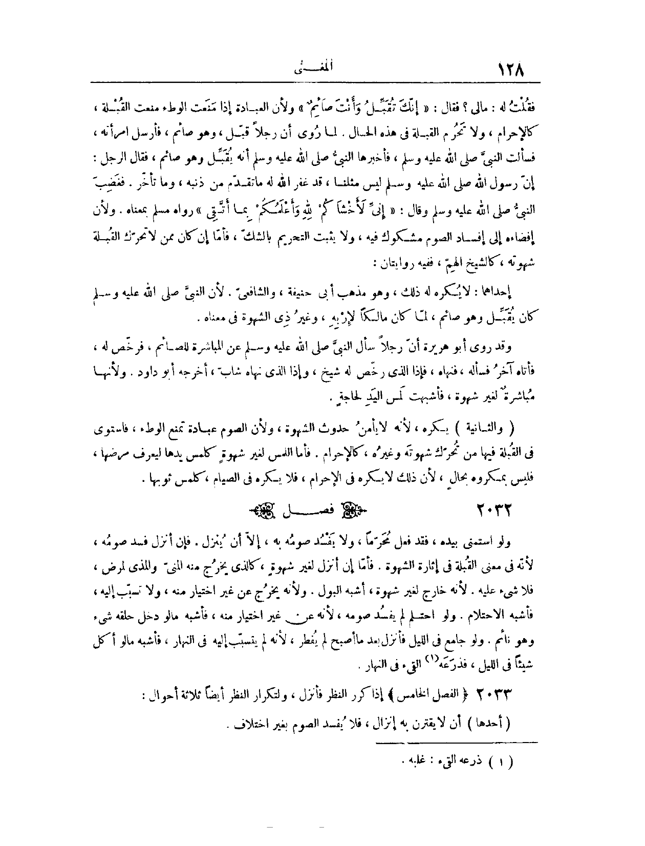 (٢٠٣٣) فَصْلٌ: وَلَوْ اسْتَمْنَى بِيَدِهِ فَقَدْ فَعَلَ مُحَرَّمًا، وَلَا يَفْسُدُ صَوْمُهُ بِهِ إلَّا أَنْ يُنْزِلَ، فَإِنْ أَنْزَلَ فَسَدَ صَوْمُهُ؛ لِأَنَّهُ فِي مَعْنَى الْقُبْلَةِ فِي إثَارَةِ الشَّهْوَةِ. فَأَمَّا إنَّ أَنْزَلَ لِغَيْرِ شَهْوَةٍ، كَاَلَّذِي يَخْرُجُ مِنْهُ الْمَنِيُّ أَوْ الْمَذْيُ لِمَرَضٍ، فَلَا شَيْءَ عَلَيْهِ؛ لِأَنَّهُ خَارِجٌ لِغَيْرِ شَهْوَةٍ، أَشْبَهَ الْبَوْلَ، وَلِأَنَّهُ يَخْرُجُ مِنْ غَيْرِ اخْتِيَارٍ مِنْهُ، وَلَا تَسَبُّبٍ إلَيْهِ، فَأَشْبَهَ الِاحْتِلَامَ. وَلَوْ احْتَلَمَ لَمْ يَفْسُدْ صَوْمُهُ، لِأَنَّهُ عَنْ غَيْرِ اخْتِيَارٍ مِنْهُ، فَأَشْبَهَ مَا لَوْ دَخَلَ حَلْقَهُ شَيْءٌ وَهُوَ نَائِمٌ. وَلَوْ جَامَعَ فِي اللَّيْلِ، فَأَنْزَلَ بَعْدَ مَا أَصْبَحَ، لَمْ يُفْطِرْ؛ لِأَنَّهُ لَمْ يَتَسَبَّبْ إلَيْهِ فِي النَّهَارِ، فَأَشْبَهَ مَا لَوْ أَكَلَ شَيْئًا فِي اللَّيْلِ، فَذَرَعَهُ الْقَيْءُ فِي النَّهَارِ.