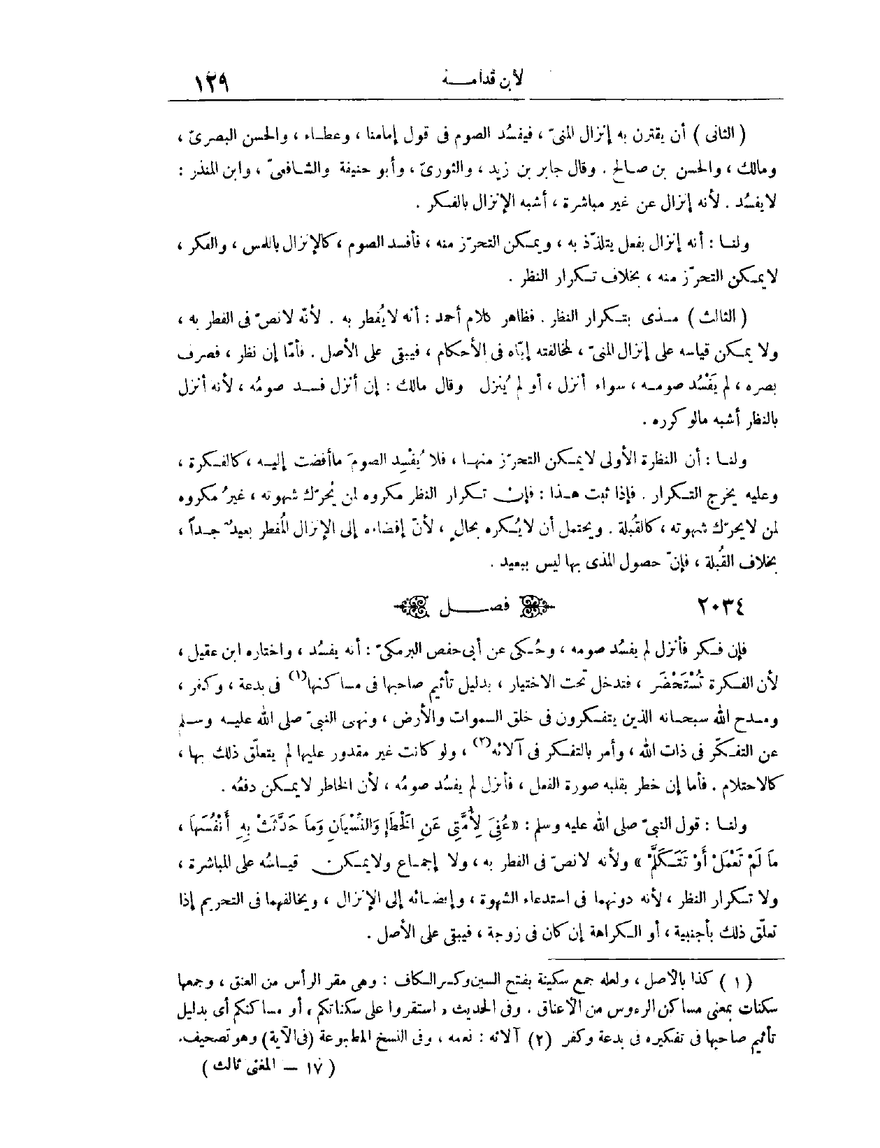 (٢٠٣٥) فَصْلٌ: فَإِنْ فَكَّرَ فَأَنْزَلَ، لَمْ يَفْسُدْ صَوْمُهُ. وَحُكِيَ عَنْ أَبِي حَفْصٍ الْبَرْمَكِيِّ، أَنَّهُ يَفْسُدُ. وَاخْتَارَهُ ابْنُ عَقِيلٍ؛ لِأَنَّ الْفِكْرَةَ تُسْتَحْضَرُ، فَتَدْخُلُ تَحْتَ الِاخْتِيَارِ، بِدَلِيلِ تَأْثِيمِ صَاحِبِهَا فِي مُسَاكَنَتِهَا، فِي بِدْعَةٍ وَكُفْرٍ، وَمَدَحَ اللَّهُ سُبْحَانَهُ الَّذِينَ يَتَفَكَّرُونَ فِي خَلْقِ السَّمَوَاتِ وَالْأَرْضِ وَنَهَى النَّبِيُّ - صَلَّى اللَّهُ عَلَيْهِ وَسَلَّمَ - عَنْ التَّفَكُّرِ فِي ذَاتِ اللَّهِ، وَأَمَرَ بِالتَّفَكُّرِ فِي آلَائِهِ، وَلَوْ كَانَتْ غَيْرَ مَقْدُورٍ عَلَيْهَا لَمْ يَتَعَلَّقْ ذَلِكَ بِهَا، كَالِاحْتِلَامِ. فَأَمَّا إنْ خَطَرَ بِقَلْبِهِ صُورَةُ الْفِعْلِ، فَأَنْزَلَ، لَمْ يَفْسُدْ صَوْمُهُ؛ لِأَنَّ الْخَاطِرَ لَا يُمْكِنُ دَفْعُهُ.
