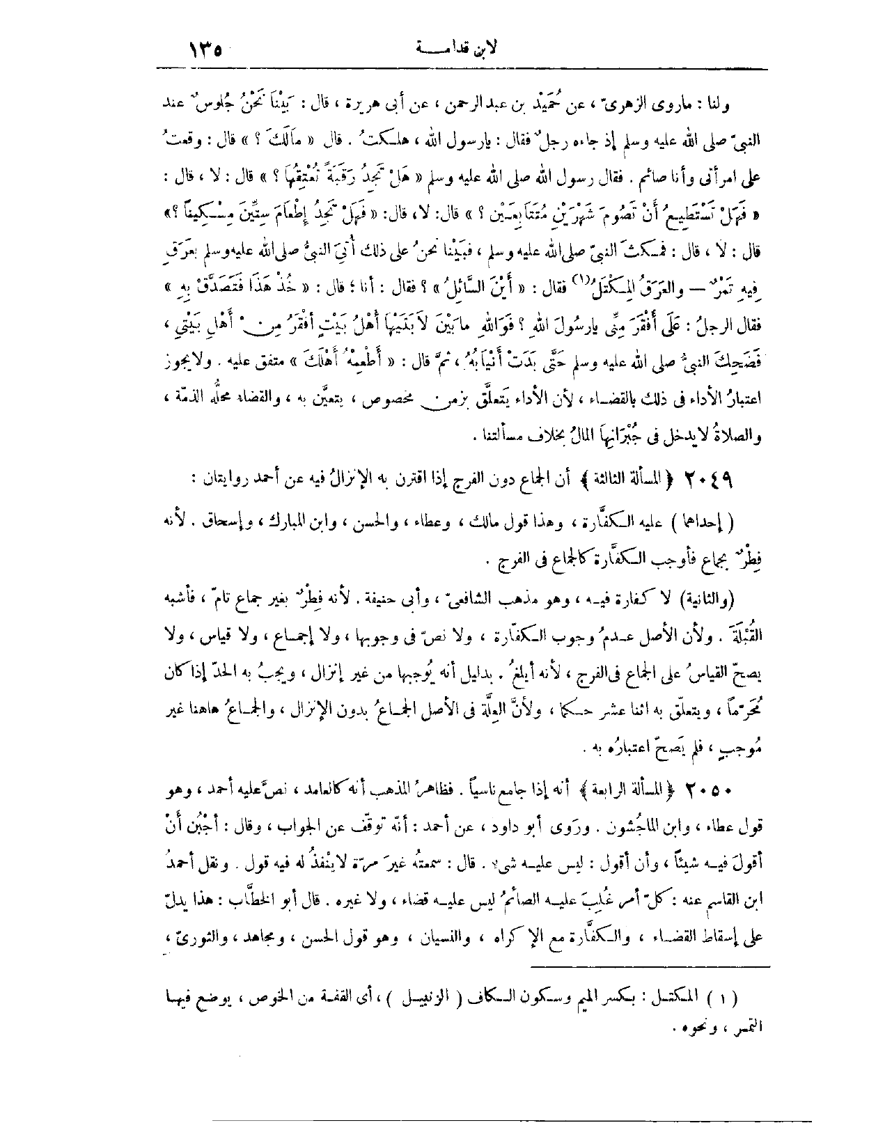 (٢٠٥٠) الْمَسْأَلَةُ الثَّالِثَةُ، أَنَّ الْجِمَاعَ دُونَ الْفَرْجِ، إذَا اقْتَرَنَ بِهِ الْإِنْزَالُ، فِيهِ عَنْ أَحْمَدَ رِوَايَتَانِ؛ إحْدَاهُمَا، عَلَيْهِ الْكَفَّارَةُ، وَهَذَا قَوْلُ مَالِكٍ، وَعَطَاءٍ وَالْحَسَنِ، وَابْنِ الْمُبَارَكِ وَإِسْحَاقَ؛ لِأَنَّهُ فِطْرٌ بِجِمَاعٍ، فَأَوْجَبَ الْكَفَّارَةَ كَالْجِمَاعِ فِي الْفَرْجِ، وَالثَّانِيَةُ: لَا كَفَّارَةَ فِيهِ.