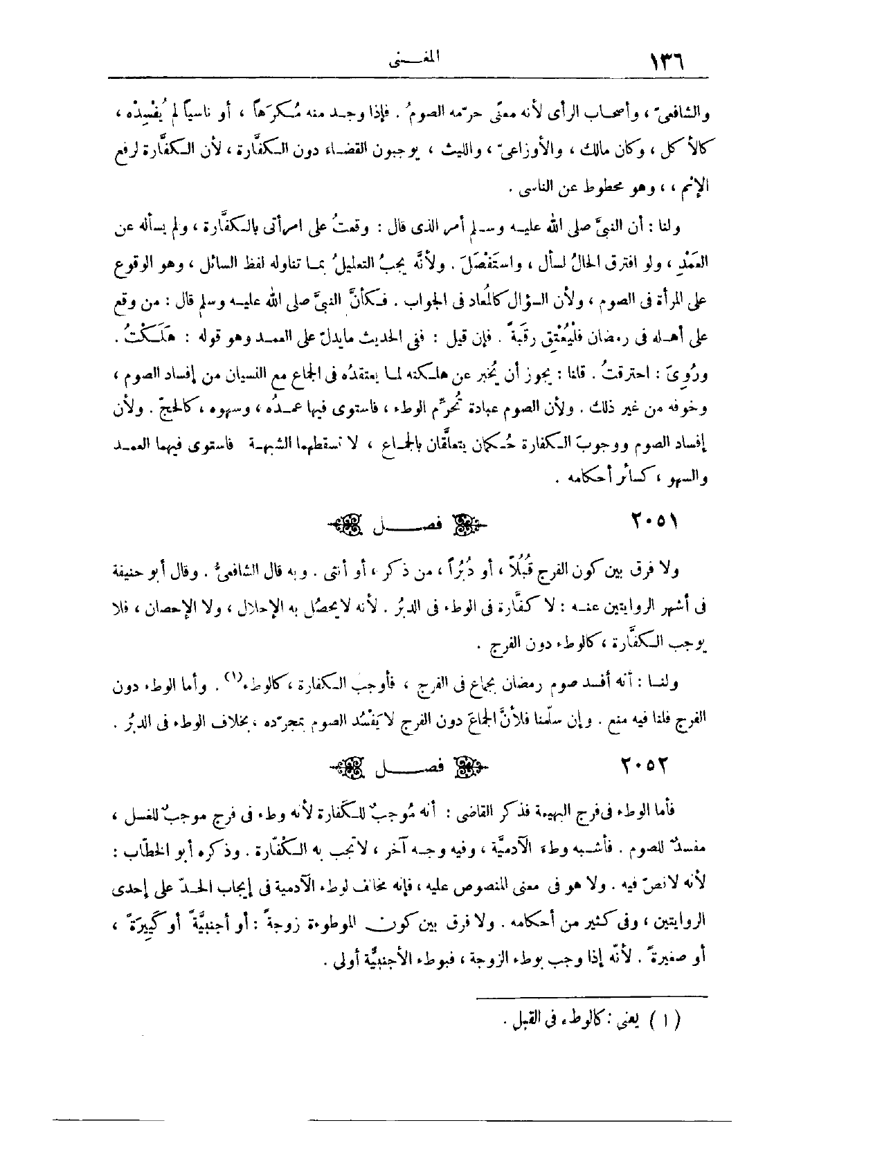 (٢٠٥٣) فَصْلٌ: فَأَمَّا الْوَطْءُ فِي فَرْجِ الْبَهِيمَةِ. فَذَكَرَ الْقَاضِي، أَنَّهُ مُوجِبٌ لِلْكَفَّارَةِ؛ لِأَنَّهُ وَطْءٌ فِي فَرْجٍ مُوجِبٌ لِلْغُسْلِ، مُفْسِدٌ لِلصَّوْمِ، فَأَشْبَهَ وَطْءَ الْآدَمِيَّةِ. وَفِيهِ وَجْهٌ آخَرُ لَا تَجِبُ بِهِ الْكَفَّارَةُ. وَذَكَرَهُ أَبُو الْخَطَّابِ؛ لِأَنَّهُ لَا نَصَّ فِيهِ، وَلَا هُوَ فِي مَعْنَى الْمَنْصُوصِ عَلَيْهِ، فَإِنَّهُ مُخَالِفٌ لِوَطْءِ الْآدَمِيَّةِ فِي إيجَابِ الْحَدِّ عَلَى إحْدَى الرِّوَايَتَيْنِ، وَفِي كَثِيرٍ مِنْ أَحْكَامِهِ.