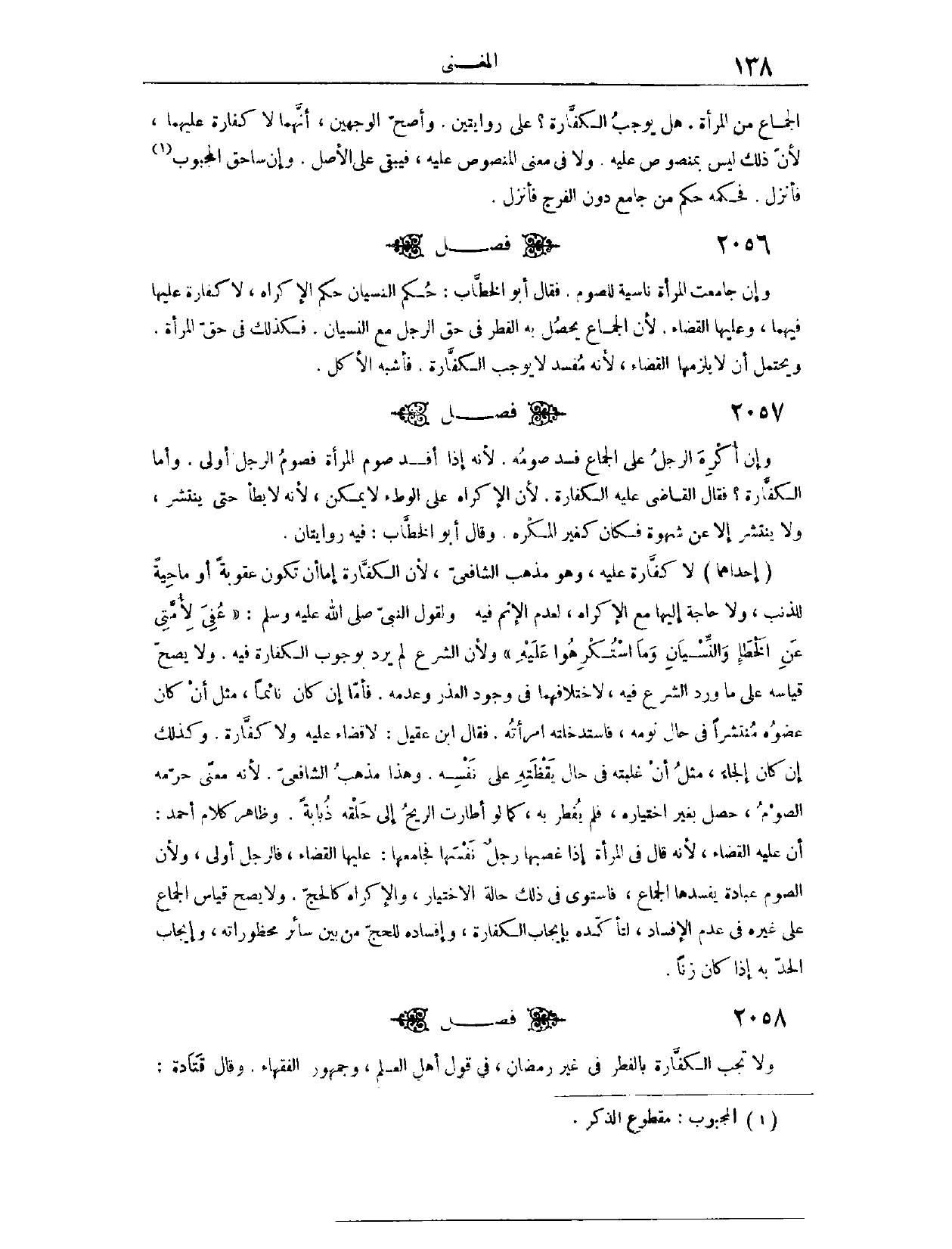 (٢٠٥٨) فَصْلٌ: وَإِنْ أُكْرِهَ الرَّجُلُ عَلَى الْجِمَاعِ، فَسَدَ صَوْمُهُ؛ لِأَنَّهُ إذَا أُفْسِدَ صَوْمُ الْمَرْأَةِ فَصَوْمُ الرَّجُلِ أَوْلَى. وَأَمَّا الْكَفَّارَةُ، فَقَالَ الْقَاضِي: عَلَيْهِ الْكَفَّارَةُ؛ لِأَنَّ الْإِكْرَاهَ عَلَى الْوَطْءِ لَا يُمْكِنُ، لِأَنَّهُ لَا يَطَأُ حَتَّى يَنْتَشِرَ، وَلَا يَنْتَشِرُ إلَّا عَنْ شَهْوَةٍ، فَكَانَ كَغَيْرِ الْمُكْرَهِ. وَقَالَ أَبُو الْخَطَّابِ: فِيهِ. رِوَايَتَانِ؛ إحْدَاهُمَا، لَا كَفَّارَةَ عَلَيْهِ. وَهُوَ مَذْهَبُ الشَّافِعِيِّ؛ لِأَنَّ الْكَفَّارَةَ إمَّا أَنْ تَكُونَ عُقُوبَةً، أَوْ مَاحِيَةً لِلذَّنْبِ، وَلَا حَاجَةَ إلَيْهَا مَعَ الْإِكْرَاهِ، لِعَدَمِ الْإِثْمِ فِيهِ، وَلِقَوْلِ النَّبِيِّ - صَلَّى اللَّهُ عَلَيْهِ وَسَلَّمَ - «عُفِيَ لِأُمَّتِي عَنْ الْخَطَأِ وَالنِّسْيَانِ، وَمَا اُسْتُكْرِهُوا عَلَيْهِ» وَلِأَنَّ الشَّرْعَ لَمْ يَرِدْ بِوُجُوبِ الْكَفَّارَةِ فِيهِ، وَلَا يَصِحُّ قِيَاسُهُ عَلَى مَا وَرَدَ الشَّرْعُ فِيهِ، لَاخْتِلَافِهِمَا فِي وُجُودِ الْعُذْرِ وَعَدَمِهِ.