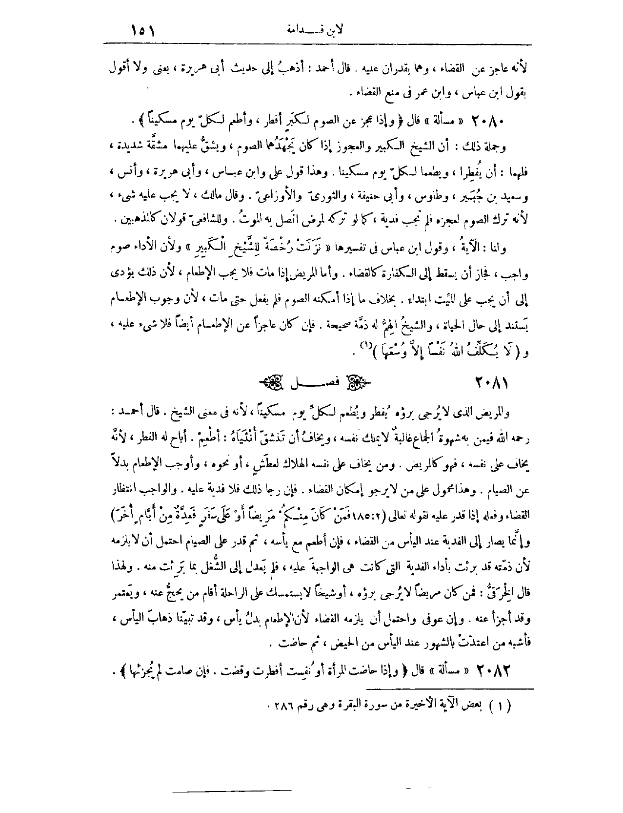 (٢٠٨٢) فَصْلٌ: وَالْمَرِيضُ الَّذِي لَا يُرْجَى بُرْؤُهُ، يُفْطِرُ، وَيُطْعِمُ لِكُلِّ يَوْمٍ مِسْكِينًا؛ لِأَنَّهُ فِي مَعْنَى الشَّيْخِ. قَالَ أَحْمَدُ، - رَحِمَهُ اللَّهُ - فِي مَنْ بِهِ شَهْوَةُ الْجِمَاعِ غَالِبَةٌ، لَا يَمْلِكُ نَفْسَهُ، وَيَخَافُ أَنْ تَنْشَقَّ أُنْثَيَاهُ: أَطْعِمْ. أَبَاحَ لَهُ الْفِطْرَ؛ لِأَنَّهُ يَخَافُ عَلَى نَفْسِهِ، فَهُوَ كَالْمَرِيضِ، وَمِنْ يَخَافُ عَلَى نَفْسِهِ الْهَلَاكَ لِعَطَشٍ أَوْ نَحْوِهِ، وَأَوْجَبَ الْإِطْعَامَ بَدَلًا عَنْ الصِّيَامِ، وَهَذَا مَحْمُولٌ عَلَى مَنْ لَا يَرْجُو إمْكَانَ الْقَضَاءِ، فَإِنْ رَجَا ذَلِكَ فَلَا فِدْيَةَ عَلَيْهِ، وَالْوَاجِبُ انْتِظَارُ الْقَضَاءِ وَفِعْلُهُ إذَا قَدَرَ عَلَيْهِ، لِقَوْلِهِ تَعَالَى: {فَمَنْ كَانَ مِنْكُمْ مَرِيضًا أَوْ عَلَى سَفَرٍ فَعِدَّةٌ مِنْ أَيَّامٍ أُخَرَ} [البقرة: ١٨٤] .