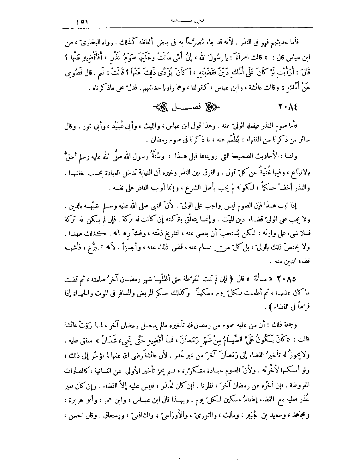 (٢٠٨٥) فَصْلٌ: فَأَمَّا صَوْمُ النَّذْرِ فَيَفْعَلُهُ الْوَلِيُّ عَنْهُ، وَهَذَا قَوْلُ ابْنِ عَبَّاسٍ، وَاللَّيْثِ، وَأَبِي عُبَيْدٍ، وَأَبِي ثَوْرٍ. وَقَالَ سَائِرُ مَنْ ذَكَرْنَا مِنْ الْفُقَهَاءِ: يُطْعِمُ عَنْهُ؛ لِمَا ذَكَرْنَا فِي صَوْمِ رَمَضَانَ. وَلَنَا الْأَحَادِيثُ الصَّحِيحَةُ الَّتِي رَوَيْنَاهَا قَبْلَ هَذَا، وَسُنَّةُ رَسُولِ اللَّهِ - صَلَّى اللَّهُ عَلَيْهِ وَسَلَّمَ - أَحَقُّ بِالِاتِّبَاعِ، وَفِيهَا غُنْيَةً عَنْ كُلِّ قَوْلٍ، وَالْفَرْقُ بَيْنَ النَّذْرِ وَغَيْرِهِ أَنَّ النِّيَابَةَ تَدْخُلُ الْعِبَادَةَ بِحَسَبِ خِفَّتِهَا، وَالنَّذْرُ أَخَفُّ حُكْمًا؛ لِكَوْنِهِ لَمْ يَجِبْ بِأَصْلِ الشَّرْعِ، وَإِنَّمَا أَوْجَبَهُ النَّاذِرُ عَلَى نَفْسِهِ.