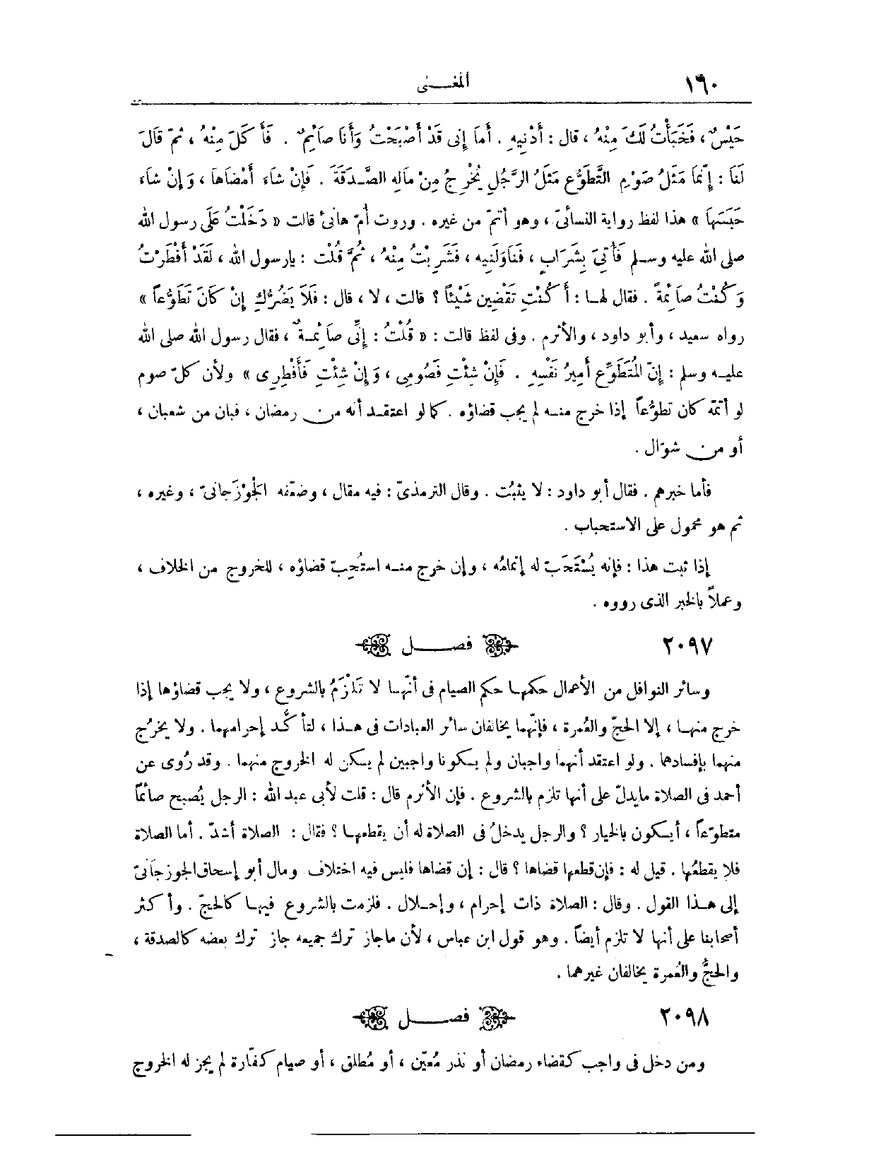 وَأَكْثَرُ أَصْحَابِنَا عَلَى أَنَّهَا لَا تَلْزَمُ أَيْضًا. وَهُوَ قَوْلُ ابْنِ عَبَّاسٍ؛ لِأَنَّ مَا جَازَ تَرْكُ جَمِيعِهِ جَازَ تَرْكُ بَعْضِهِ، كَالصَّدَقَةِ، وَالْحَجُّ وَالْعُمْرَةُ يُخَالِفَانِ غَيْرَهُمَا. (٢٠٩٩) فَصْلٌ: وَمِنْ دَخَلَ فِي وَاجِبٍ، كَقَضَاءِ رَمَضَان، أَوْ نَذْرٍ مُعَيَّنٍ أَوْ مُطْلَقٍ، أَوْ صِيَامِ كَفَّارَةٍ؛ لَمْ يَجُزْ لَهُ الْخُرُوجُ مِنْهُ؛
