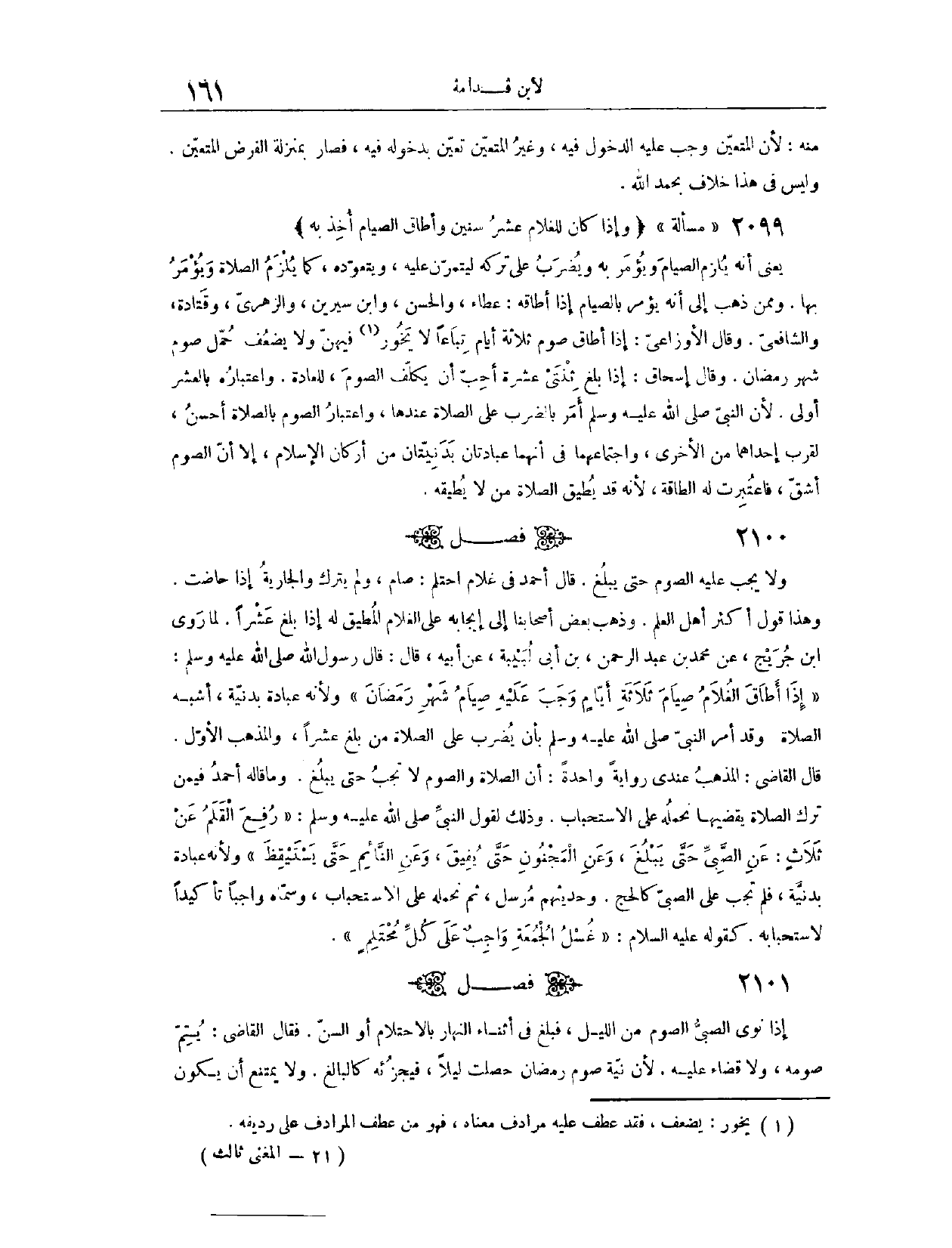 (٢١٠٠) مَسْأَلَةٌ: قَالَ (وَإِذَا كَانَ لِلْغُلَامِ عَشْرُ سِنِينَ، وَأَطَاقَ الصِّيَامَ أَخَذَ بِهِ) يَعْنِي أَنَّهُ يُلْزَمُ الصِّيَامَ، يُؤْمَرُ بِهِ وَيُضْرَبُ عَلَى تَرْكِهِ، لِيَتَمَرَّن عَلَيْهِ، وَيَتَعَوَّدَهُ، كَمَا يُلْزَمُ الصَّلَاةَ وَيُؤْمَرُ بِهَا، وَمِمَّنْ ذَهَبِ إلَى أَنَّهُ يُؤْمَرُ بِالصِّيَامِ إذَا أَطَاقَهُ، عَطَاءٌ، وَالْحَسَنُ، وَابْنُ سِيرِينَ، وَالزُّهْرِيُّ وَقَتَادَةُ، وَالشَّافِعِيُّ وَقَالَ الْأَوْزَاعِيُّ إذَا أَطَاقَ صَوْمِ ثَلَاثَةِ أَيَّامٍ تُبَاعَا، لَا يَخُورُ فِيهِنَّ وَلَا يَضْعُفُ، حُمِّلَ صَوْمِ شَهْرِ رَمَضَان وَقَالَ إِسْحَاقُ: إذَا بَلَغَ ثِنْتَيْ عَشَرَةَ أُحِبُّ أَنْ يُكَلَّفَ الصَّوْمَ لِلْعَادَةِ. وَاعْتِبَارُهُ بِالْعَشْرِ أَوْلَى؛ لِأَنَّ النَّبِيَّ - صَلَّى اللَّهُ عَلَيْهِ وَسَلَّمَ - أَمَرَ بِالضَّرْبِ عَلَى الصَّلَاةِ عِنْدَهَا، وَاعْتِبَارُ الصَّوْمِ بِالصَّلَاةِ أَحْسَن لِقُرْبِ إحْدَاهُمَا مِنْ الْأُخْرَى، وَاجْتِمَاعِهِمَا فِي أَنَّهُمَا عِبَادَتَانِ بَدَنِيَّتَانِ مِنْ أَرْكَانِ الْإِسْلَامِ، إلَّا أَنَّ الصَّوْمَ أُشَقُّ فَاعْتُبِرَتْ لَهُ الطَّاقَةُ، لِأَنَّهُ قَدْ يُطِيقُ الصَّلَاةَ مَنْ لَا يُطِيقُهُ. (٢١٠١)