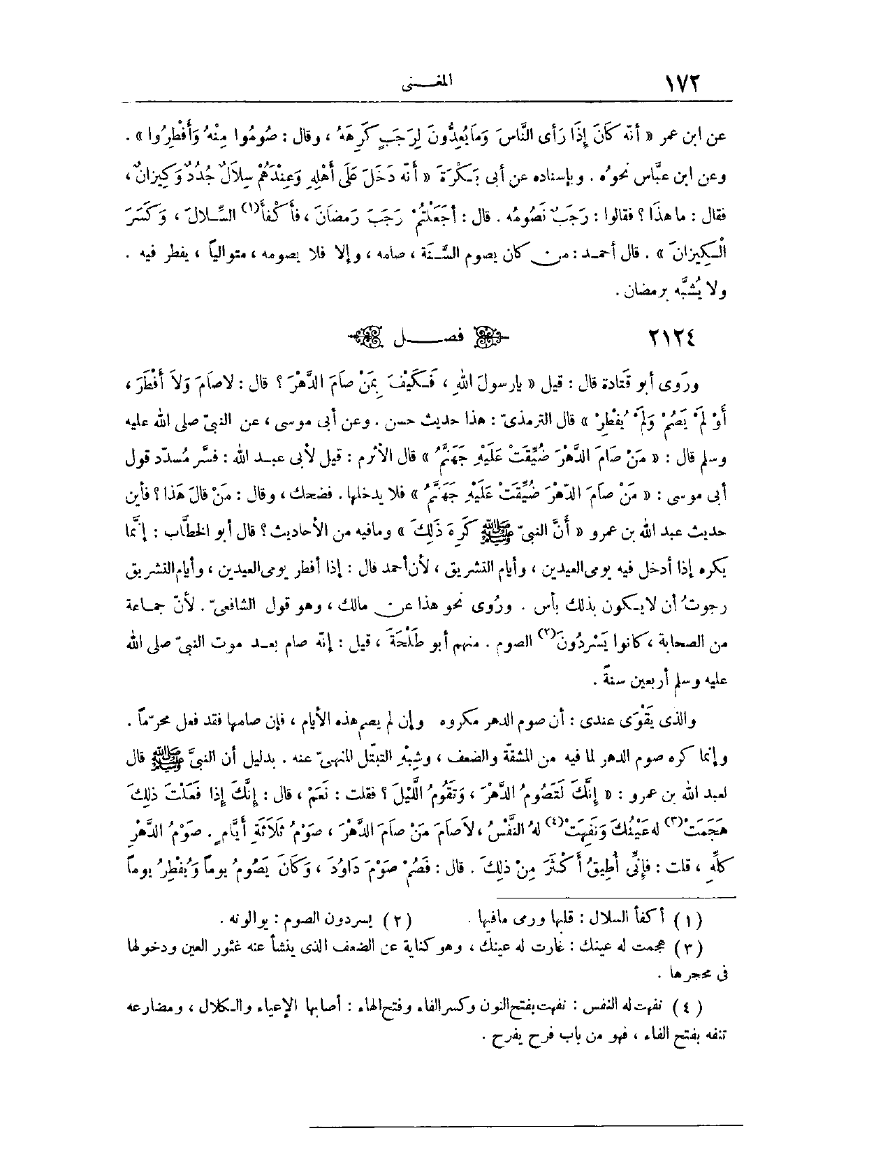 (٢١٢٥) فَصْلٌ: وَرَوَى أَبُو قَتَادَةَ، قَالَ: «قِيلَ: يَا رَسُولَ اللَّهِ، فَكَيْفَ بِمَنْ صَامَ الدَّهْرَ؟ قَالَ: لَا صَامَ وَلَا أَفْطَرَ، أَوْ لَمْ يَصُمْ وَلَمْ يُفْطِرْ» . قَالَ التِّرْمِذِيُّ: هَذَا حَدِيثٌ حَسَنٌ. وَعَنْ أَبِي مُوسَى، عَنْ النَّبِيِّ - صَلَّى اللَّهُ عَلَيْهِ وَسَلَّمَ - قَالَ: «مَنْ صَامَ الدَّهْرَ ضُيِّقَتْ عَلَيْهِ جَهَنَّمُ» . قَالَ الْأَثْرَمُ: قِيلَ لِأَبِي عَبْدِ اللَّهِ: فَسَّرَ مُسَدِّدٌ قَوْلَ أَبِي مُوسَى: (مَنْ صَامَ الدَّهْرَ ضُيِّقَتْ عَلَيْهِ جَهَنَّمُ) . فَلَا يَدْخُلُهَا. فَضَحِكَ وَقَالَ: مَنْ قَالَ هَذَا؟ فَأَيْنَ حَدِيثُ عَبْدِ اللَّهِ بْنِ عَمْرٍو، أَنَّ النَّبِيَّ - صَلَّى اللَّهُ عَلَيْهِ وَسَلَّمَ - كَرِهَ ذَلِكَ، وَمَا فِيهِ مِنْ الْأَحَادِيثِ؟ قَالَ أَبُو الْخَطَّابِ: إنَّمَا يُكْرَه إذَا أَدْخَلَ فِيهِ يَوْمَيْ الْعِيدَيْنِ وَأَيَّامَ التَّشْرِيقِ؛ لِأَنَّ أَحْمَدَ قَالَ: إذَا أَفْطَرَ يَوْمَيْ الْعِيدَيْنِ وَأَيَّامَ التَّشْرِيقِ رَجَوْت أَنْ لَا يَكُونَ بِذَلِكَ بَأْسٌ.