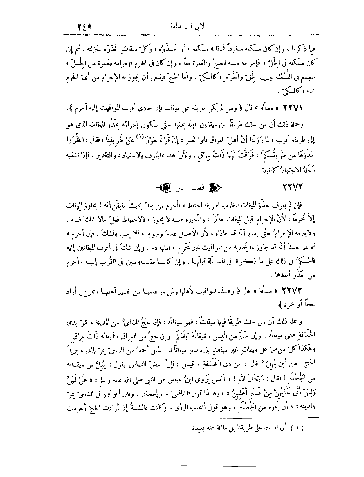 (٢٢٧٢) مَسْأَلَةٌ: قَالَ: (وَمَنْ لَمْ يَكُنْ طَرِيقُهُ عَلَى مِيقَاتٍ، فَإِذَا حَاذَى أَقْرَبَ الْمَوَاقِيتِ إلَيْهِ أَحْرَمَ) وَجُمْلَةُ ذَلِكَ أَنَّ مَنْ سَلَكَ طَرِيقًا بَيْنَ مِيقَاتَيْنِ، فَإِنَّهُ يَجْتَهِدُ حَتَّى يَكُونَ إحْرَامُهُ بِحَذْوِ الْمِيقَاتِ، الَّذِي هُوَ إلَى طَرِيقِهِ أَقْرَبُ؛ لِمَا رَوَيْنَا أَنَّ أَهْلَ الْعِرَاقِ قَالُوا لِعُمَرَ: إنَّ قَرْنًا جَوْرٌ عَنْ طَرِيقِنَا. فَقَالَ: اُنْظُرُوا حَذْوَهَا مِنْ طَرِيقِكُمْ فَوَقَّتَ لَهُمْ ذَاتَ عِرْقٍ. وَلِأَنَّ هَذَا مِمَّا يُعْرَفُ بِالِاجْتِهَادِ وَالتَّقْدِيرِ، فَإِذَا اشْتَبَهَ دَخَلَهُ الِاجْتِهَادُ، كَالْقِبْلَةِ.
