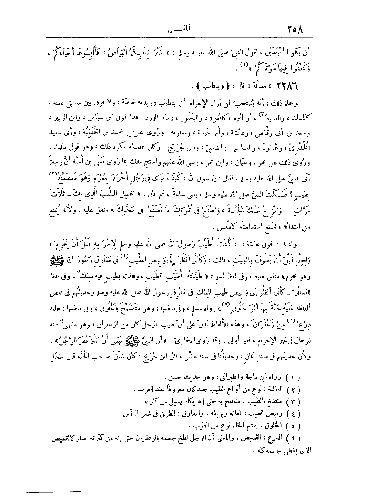 (٢٢٨٧) مَسْأَلَةٌ: قَالَ: (وَيَتَطَيَّبُ) وَجُمْلَةُ ذَلِكَ أَنَّهُ يُسْتَحَبُّ لِمَنْ أَرَادَ الْإِحْرَامَ أَنْ يَتَطَيَّبَ فِي بَدَنِهِ خَاصَّةً، وَلَا فَرْقَ بَيْنَ مَا يَبْقَى عَيْنُهُ كَالْمِسْكِ وَالْغَالِيَةِ، أَوْ أَثَرُهُ كَالْعُودِ وَالْبَخُورِ وَمَاءِ الْوَرْدِ. هَذَا قَوْلُ ابْنِ عَبَّاسٍ، وَابْنِ الزُّبَيْرِ، وَسَعْدِ بْن أَبِي وَقَّاصٍ، وَعَائِشَةَ، وَأُمِّ حَبِيبَةَ، وَمُعَاوِيَةَ.