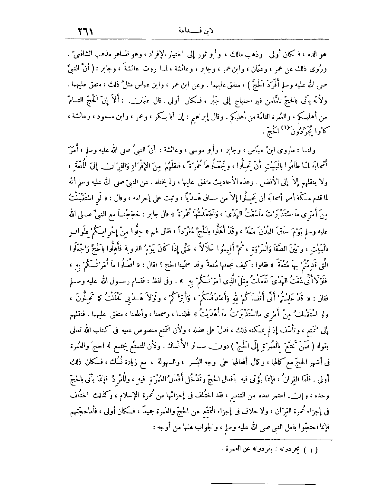 قَالَ عُثْمَانُ: أَلَا إنَّ الْحَجَّ التَّامَّ مِنْ أَهْلِيكُمْ، وَالْعُمْرَةَ التَّامَّةَ مِنْ أَهْلِيكُمْ. وَقَالَ إبْرَاهِيمُ: إنَّ أَبَا بَكْرٍ، وَعُمَرَ، وَابْنَ مَسْعُودٍ، وَعَائِشَةَ، كَانُوا يُجَرِّدُونَ الْحَجَّ. وَلَنَا، مَا رَوَى ابْنُ عَبَّاسٍ، وَجَابِرٌ، وَأَبُو مُوسَى، وَعَائِشَةُ، «أَنَّ النَّبِيَّ - صَلَّى اللَّهُ عَلَيْهِ وَسَلَّمَ - أَمَرَ أَصْحَابَهُ لَمَّا طَافُوا بِالْبَيْتِ، أَنْ يَحِلُّوا، وَيَجْعَلُوهَا عُمْرَةً» . فَنَقَلَهُمْ مِنْ الْإِفْرَادِ وَالْقِرَانِ إلَى الْمُتْعَةِ، وَلَا يَنْقُلُهُمْ إلَّا إلَى الْأَفْضَلِ. وَهَذِهِ الْأَحَادِيثُ مُتَّفَقٌ عَلَيْهَا