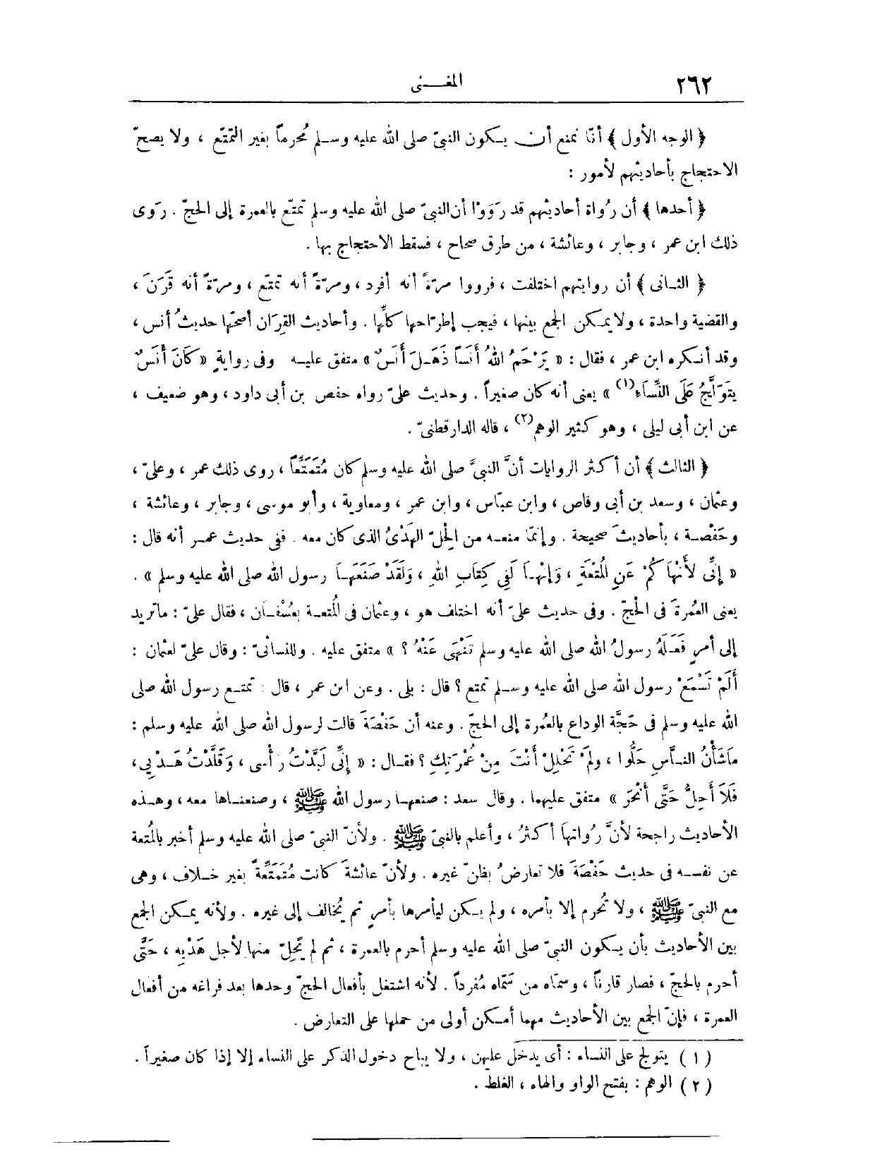 الْأَوَّلُ، أَنَّا نَمْنَعُ أَنْ يَكُونَ النَّبِيُّ - صَلَّى اللَّهُ عَلَيْهِ وَسَلَّمَ - مُحْرِمًا بِغَيْرِ التَّمَتُّعِ، وَلَا يَصِحُّ الِاحْتِجَاجُ بِأَحَادِيثِهِمْ لَأُمُورٍ؛ أَحَدُهَا، أَنَّ رُوَاةَ أَحَادِيثِهِمْ قَدْ رَوَوْا أَنَّ النَّبِيَّ - صَلَّى اللَّهُ عَلَيْهِ وَسَلَّمَ - تَمَتَّعَ بِالْعُمْرَةِ إلَى الْحَجِّ، رَوَى ذَلِكَ ابْنُ عُمَرَ، وَجَابِرٌ، وَعَائِشَةُ، مِنْ طُرُقٍ صِحَاحٍ، فَسَقَطَ الِاحْتِجَاجُ بِهَا. الثَّانِي، أَنَّ رِوَايَتَهُمْ اخْتَلَفَتْ، فَرَوَوْا مَرَّةً أَنَّهُ أَفْرَدَ، وَمَرَّةً أَنَّهُ تَمَتَّعَ، وَمَرَّةً أَنَّهُ قَرَنَ، وَالْقَضِيَّةُ وَاحِدَةٌ، وَلَا يُمْكِنُ الْجَمْعُ بَيْنَهَا، فَيَجِبُ اطِّرَاحُهَا كُلِّهَا، وَأَحَادِيثُ الْقِرَانِ أَصَحُّهَا حَدِيثُ أَنَسٍ، وَقَدْ أَنْكَرَهُ ابْنُ عُمَرَ، فَقَالَ: يَرْحَمُ اللَّهُ أَنَسًا، ذَهِلَ أَنَسٌ. مُتَّفَقٌ عَلَيْهِ. وَفِي رِوَايَةٍ: كَانَ أَنَسٌ يَتَوَلَّجُ عَلَى النِّسَاءِ. يَعْنِي أَنَّهُ كَانَ صَغِيرًا. وَحَدِيثُ عَلِيٍّ رَوَاهُ حَفْصُ بْنُ أَبِي دَاوُد، وَهُوَ ضَعِيفٌ، عَنْ ابْنِ أَبِي لَيْلَى، وَهُوَ كَثِيرُ الْوَهْمِ. قَالَهُ الدَّارَقُطْنِيّ. الثَّالِثُ، أَنَّ أَكْثَرَ الرِّوَايَاتِ، أَنَّ النَّبِيَّ - صَلَّى اللَّهُ عَلَيْهِ وَسَلَّمَ - كَانَ مُتَمَتِّعًا. رَوَى ذَلِكَ عُمَرُ، وَعَلِيٌّ، وَعُثْمَانُ، وَسَعْدُ بْنُ أَبِي وَقَّاصٍ، وَابْنُ عَبَّاسٍ، وَابْنُ عُمَرَ، وَمُعَاوِيَةُ، وَأَبُو مُوسَى، وَجَابِرٌ، وَعَائِشَةُ، وَحَفْصَةُ، بِأَحَادِيثَ صَحِيحَةٍ، وَإِنَّمَا مَنَعَهُ مِنْ الْحِلِّ الْهَدْيُ الَّذِي كَانَ مَعَهُ، فَفِي حَدِيثِ عُمَرَ، أَنَّهُ قَالَ: «إنِّي لَا أَنْهَاكُمْ عَنْ الْمُتْعَةِ، وَإِنَّهَا لَفِي كِتَابِ اللَّهِ، وَلَقَدْ صَنَعَهَا رَسُولُ اللَّهِ - صَلَّى اللَّهُ عَلَيْهِ وَسَلَّمَ -.» يَعْنِي الْعُمْرَةَ فِي الْحَجِّ.