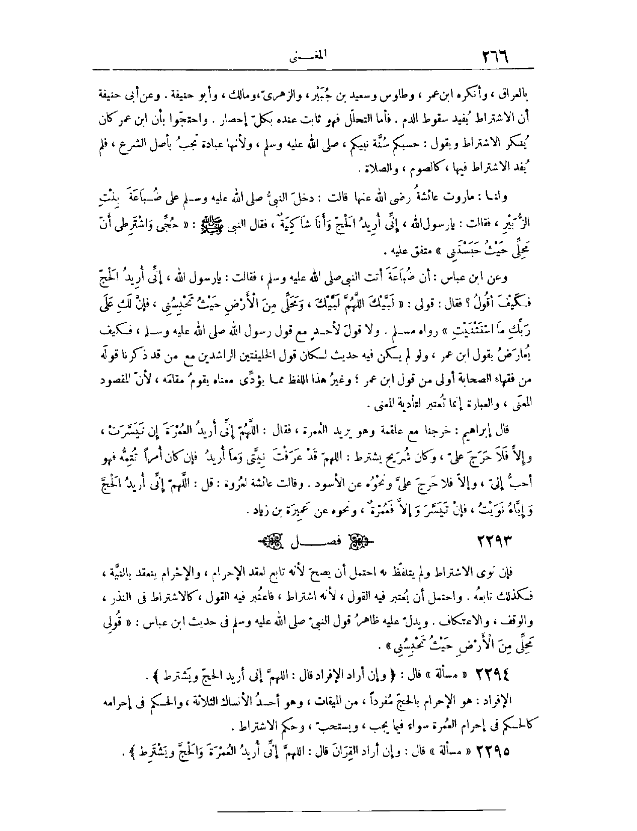 (٢٢٩٥) مَسْأَلَةٌ: قَالَ: (وَإِنْ أَرَادَ الْإِفْرَادَ، قَالَ: اللَّهُمَّ إنِّي أُرِيدُ الْحَجَّ. وَيَشْتَرِطُ) الْإِفْرَادُ: هُوَ الْإِحْرَامُ بِالْحَجِّ مُفْرَدًا مِنْ الْمِيقَاتِ، وَهُوَ أَحَدُ الْأَنْسَاكِ الثَّلَاثَةِ، وَالْحُكْمُ فِي إحْرَامِهِ كَالْحُكْمِ فِي إحْرَامِ الْعُمْرَةِ، سَوَاءٌ، فِيمَا يَجِبُ وَيُسْتَحَبُّ وَحُكْمِ الِاشْتِرَاطِ.