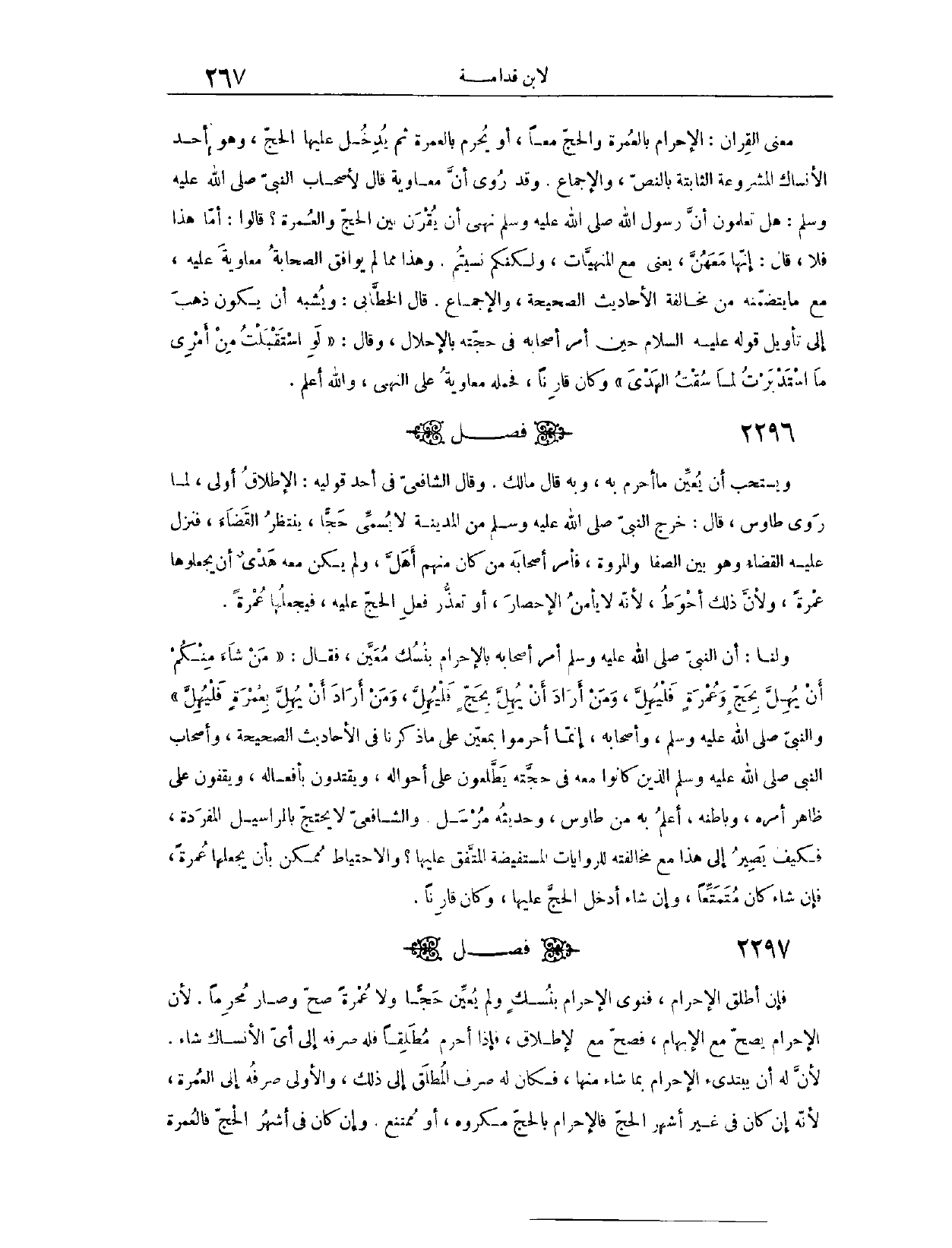 (٢٢٩٧) فَصْلٌ: وَيُسْتَحَبُّ أَنْ يُعَيِّنَ مَا أَحْرَمَ بِهِ، وَبِهِ قَالَ مَالِكٌ. وَقَالَ الشَّافِعِيُّ، فِي أَحَدِ قَوْلَيْهِ: الْإِطْلَاقُ أَوْلَى؛ لِمَا رَوَى طَاوُسٌ، قَالَ: خَرَجَ النَّبِيُّ - صَلَّى اللَّهُ عَلَيْهِ وَسَلَّمَ - مِنْ الْمَدِينَةِ، لَا يُسَمِّي حَجًّا، يَنْتَظِرُ الْقَضَاءَ، فَنَزَلَ عَلَيْهِ الْقَضَاءُ وَهُوَ بَيْنَ الصَّفَا وَالْمَرْوَةِ، فَأَمَرَ أَصْحَابَهُ مَنْ كَانَ مِنْهُمْ أَهَلَّ، وَلَمْ يَكُنْ مَعَهُ هَدْيٌ، أَنْ يَجْعَلُوهَا عُمْرَةً. وَلِأَنَّ ذَلِكَ أَحْوَطُ؛ لِأَنَّهُ لَا يَأْمَنُ الْإِحْصَارَ، أَوْ تَعَذَّرَ فِعْلُ الْحَجِّ عَلَيْهِ، فَيَجْعَلُهَا عُمْرَةً، وَلَنَا، أَنَّ النَّبِيَّ - صَلَّى اللَّهُ عَلَيْهِ وَسَلَّمَ - أَمَرَ أَصْحَابَهُ بِالْإِحْرَامِ بِنُسُكٍ مُعَيَّنٍ، فَقَالَ: «مَنْ شَاءَ مِنْكُمْ أَنْ يُهِلَّ بِحَجٍّ وَعُمْرَةٍ، فَلْيُهِلَّ، وَمَنْ أَرَادَ أَنْ يُهِلَّ بِحَجٍّ، فَلْيُهِلَّ، وَمَنْ أَرَادَ أَنْ يُهِلَّ بِعُمْرَةٍ، فَلْيُهِلَّ» .
