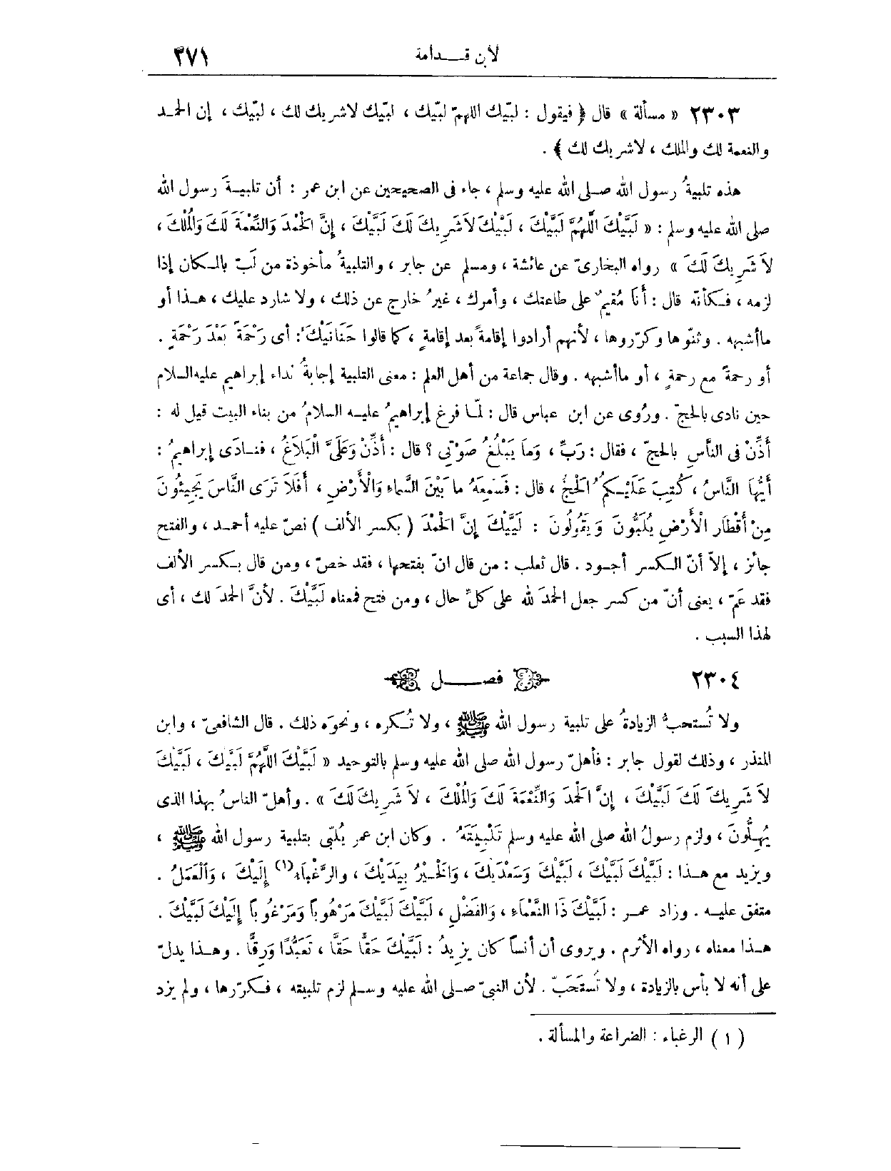 (٢٣٠٤) مَسْأَلَةٌ: قَالَ: (فَيَقُولُ: لَبَّيْكَ اللَّهُمَّ لَبَّيْكَ، لَبَّيْكَ لَا شَرِيكَ لَك لَبَّيْكَ، إنَّ الْحَمْدَ وَالنِّعْمَةَ لَك وَالْمُلْكَ، لَا شَرِيكَ لَك) هَذِهِ تَلْبِيَةُ رَسُولِ اللَّهِ - صَلَّى اللَّهُ عَلَيْهِ وَسَلَّمَ - جَاءَ فِي الصَّحِيحَيْنِ عَنْ ابْنِ عُمَرَ، أَنَّ «تَلْبِيَةَ رَسُولِ اللَّهِ - صَلَّى اللَّهُ عَلَيْهِ وَسَلَّمَ -: لَبَّيْكَ اللَّهُمَّ لَبَّيْكَ، لَبَّيْكَ لَا شَرِيكَ لَك لَبَّيْكَ، إنَّ الْحَمْدَ وَالنِّعْمَةَ لَك وَالْمُلْكَ، لَا شَرِيكَ لَك» وَرَوَاهُ الْبُخَارِيُّ، عَنْ عَائِشَةَ، وَمُسْلِمٌ عَنْ جَابِرٍ. وَالتَّلْبِيَةُ مَأْخُوذَةٌ مِنْ لَبَّ بِالْمَكَانِ. إذَا لَزِمَهُ، فَكَأَنَّهُ قَالَ: أَنَا مُقِيمٌ عَلَى طَاعَتِك وَأَمْرِك، غَيْرُ خَارِجٍ عَنْ ذَلِكَ، وَلَا شَارِدٌ عَلَيْك. هَذَا أَوْ مَا أَشْبَهَهُ، وَثَنَّوْهَا وَكَرَّرُوهَا؛ لِأَنَّهُمْ أَرَادُوا إقَامَةً بَعْدَ إقَامَةٍ، كَمَا قَالُوا: حَنَانَيْكَ. أَيْ رَحْمَةً بَعْدَ رَحْمَةٍ، أَوْ رَحْمَةً مَعَ رَحْمَةٍ، أَوْ مَا أَشْبَهَهُ. وَقَالَ جَمَاعَةٌ مِنْ أَهْلِ الْعِلْمِ: مَعْنَى التَّلْبِيَةِ إجَابَةُ نِدَاءِ إبْرَاهِيمَ - عَلَيْهِ السَّلَامُ -، حِينَ نَادَى بِالْحَجِّ. وَرُوِيَ عَنْ ابْنِ عَبَّاسٍ قَالَ: «لَمَّا فَرَغَ إبْرَاهِيمُ - عَلَيْهِ السَّلَامُ - مِنْ بِنَاءِ الْبَيْتِ، قِيلَ لَهُ: أَذِّنْ فِي النَّاسِ بِالْحَجِّ. فَقَالَ: رَبِّ وَمَا يَبْلُغُ صَوْتِي. قَالَ: أَذِّنْ وَعَلَيَّ الْبَلَاغُ. فَنَادَى إبْرَاهِيمُ: أَيُّهَا النَّاسُ، كُتِبَ عَلَيْكُمْ الْحَجُّ. قَالَ فَسَمِعَهُ مَا بَيْنَ السَّمَاءِ وَالْأَرْضِ» . أَفَلَا تَرَى النَّاسَ يَجِيئُونَ مِنْ أَقْطَارِ الْأَرْضِ يُلَبُّونَ. وَيَقُولُونَ: لَبَّيْكَ، إنَّ الْحَمْدَ. بِكَسْرِ الْأَلِفِ. نَصَّ عَلَيْهِ أَحْمَدُ وَالْفَتْحُ جَائِزٌ، إلَّا أَنَّ الْكَسْرَ أَجْوَدُ. قَالَ ثَعْلَبٌ: مَنْ قَالَ أَنَّ بِفَتْحِهَا فَقَدْ خَصَّ، وَمَنْ قَالَ بِكَسْرِ الْأَلِفِ فَقَدْ عَمَّ. يَعْنِي أَنَّ مَنْ كَسَرَ جَعَلَ الْحَمْدَ لِلَّهِ عَلَى كُلِّ حَالٍ، وَمِنْ فَتَحَ فَمَعْنَاهُ لَبَّيْكَ؛ لِأَنَّ الْحَمْدَ لَك، أَيْ لِهَذَا السَّبَبِ.