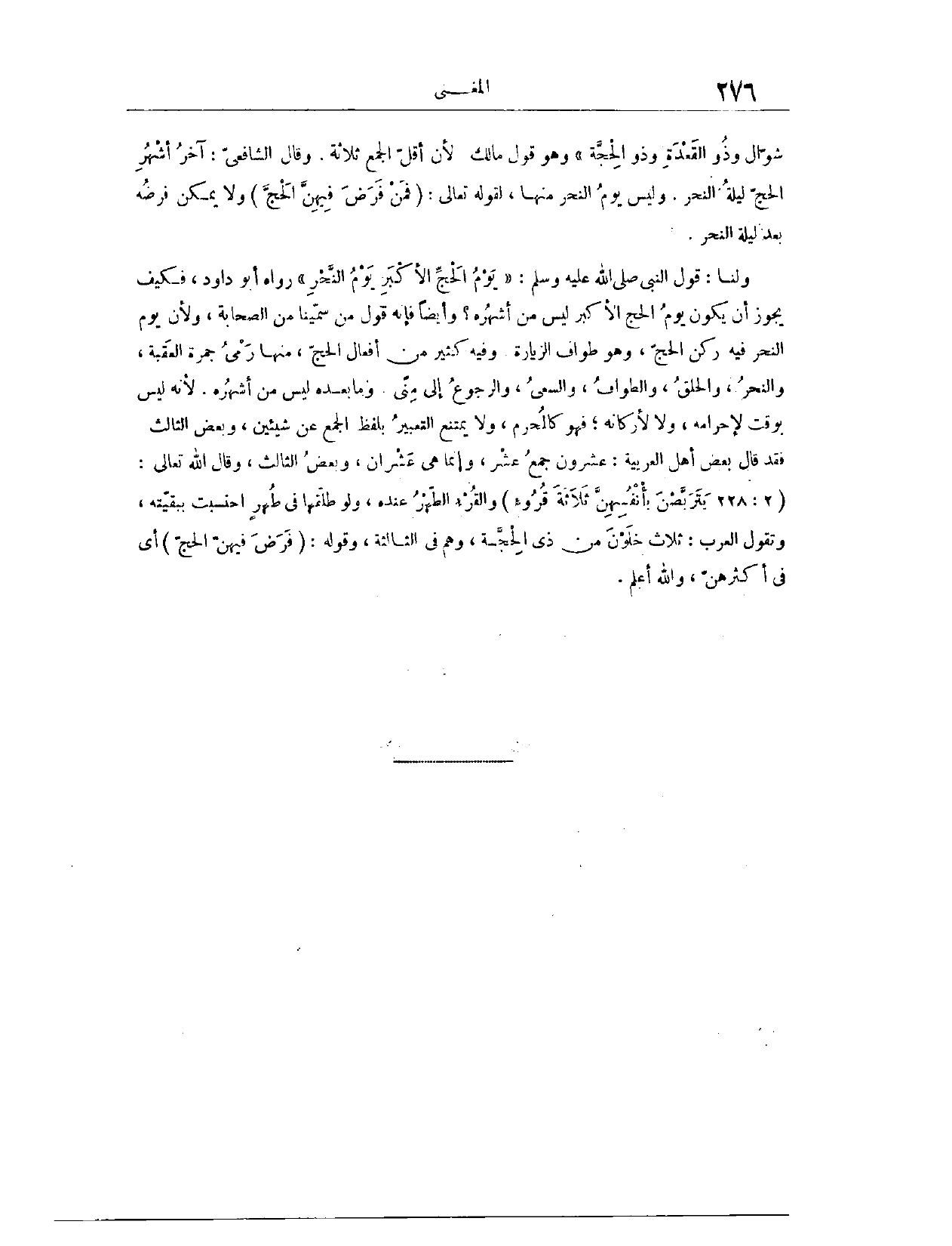 وَلَنَا، قَوْلُ النَّبِيِّ - صَلَّى اللَّهُ عَلَيْهِ وَسَلَّمَ -: «يَوْمُ الْحَجِّ الْأَكْبَرِ يَوْمُ النَّحْرِ» . رَوَاهُ أَبُو دَاوُد. فَكَيْفَ يَجُوزُ أَنْ يَكُونَ يَوْمُ الْحَجِّ الْأَكْبَرِ لَيْسَ مِنْ أَشْهُرِهِ، وَأَيْضًا فَإِنَّهُ قَوْلُ مَنْ سَمَّيْنَا مِنْ الصَّحَابَةِ، وَلِأَنَّ يَوْمَ النَّحْرِ فِيهِ رُكْنُ الْحَجِّ، وَهُوَ طَوَافُ الزِّيَارَةِ، وَفِيهِ كَثِيرٌ مِنْ أَفْعَالِ الْحَجِّ، مِنْهَا: رَمْيُ جَمْرَةِ الْعَقَبَةِ، وَالنَّحْرُ، وَالْحَلْقُ، وَالطَّوَافُ، وَالسَّعْيُ، وَالرُّجُوعُ إلَى مِنًى، وَمَا بَعْدَهُ لَيْسَ مِنْ أَشْهُرِهِ؛ لِأَنَّهُ لَيْسَ بِوَقْتٍ لِإِحْرَامِهِ، وَلَا لِأَرْكَانِهِ، فَهُوَ كَالْمُحَرَّمِ، وَلَا يَمْتَنِعُ التَّعْبِيرُ بِلَفْظِ الْجَمْعِ عَنْ شَيْئَيْنِ، وَبَعْضِ الثَّالِثِ، فَقَدْ قَالَ بَعْضُ أَهْلِ الْعَرَبِيَّةِ: عِشْرُونَ جَمْعُ عَشْرٍ، وَإِنَّمَا هِيَ عُشْرَانِ وَبَعْضُ الثَّالِثِ، وَقَالَ اللَّهُ تَعَالَى {يَتَرَبَّصْنَ بِأَنْفُسِهِنَّ ثَلاثَةَ قُرُوءٍ} [البقرة: ٢٢٨] .