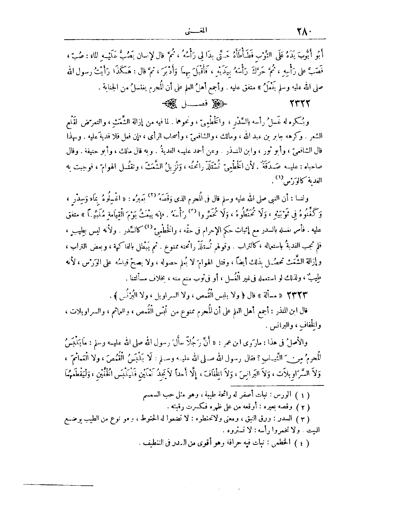 (٢٣٢٣) فَصْلٌ: وَيُكْرَهُ لَهُ غَسْلُ رَأْسِهِ بِالسِّدْرِ وَالْخِطْمِيِّ وَنَحْوِهِمَا؛ لِمَا فِيهِ مِنْ إزَالَةِ الشُّعْثِ، وَالتَّعَرُّضِ لِقَلْعِ الشَّعْرِ. وَكَرِهَهُ جَابِرُ بْنُ عَبْدِ اللَّهِ، وَمَالِكٌ، وَالشَّافِعِيّ، وَأَصْحَابُ الرَّأْيِ. فَإِنْ فَعَلَ فَلَا فِدْيَةَ عَلَيْهِ. وَبِهَذَا قَالَ الشَّافِعِيُّ، وَأَبُو ثَوْرٍ، وَابْنُ الْمُنْذِرِ.