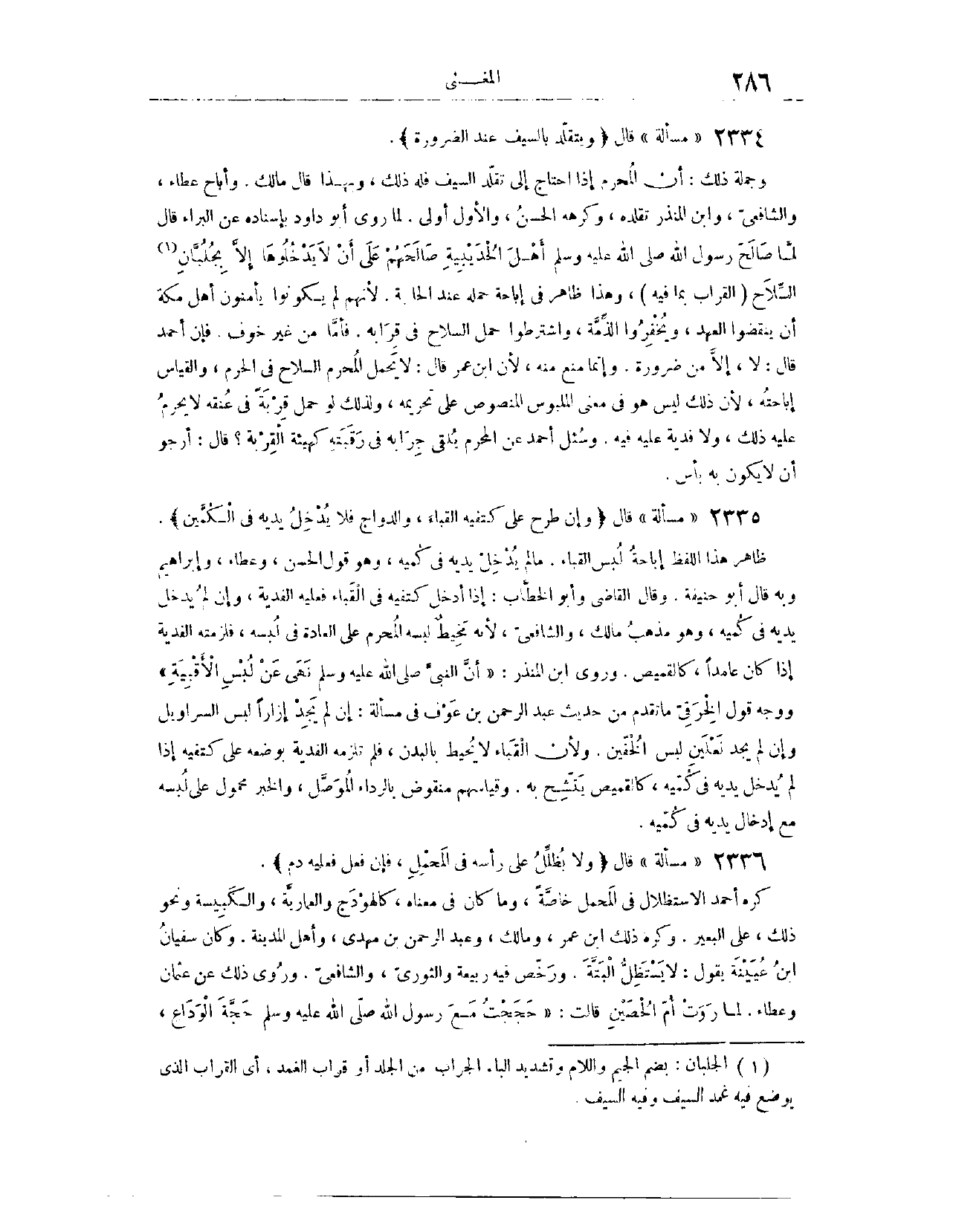 (٢٣٣٥) مَسْأَلَةٌ: قَالَ: (وَيَتَقَلَّدُ بِالسَّيْفِ عِنْدَ الضَّرُورَةِ) وَجُمْلَةُ ذَلِكَ أَنَّ الْمُحْرِمَ إذَا احْتَاجَ إلَى تَقَلُّدِ السَّيْفِ، فَلَهُ ذَلِكَ. وَبِهَذَا قَالَ مَالِكٌ. وَأَبَاحَ عَطَاءٌ، وَالشَّافِعِيُّ، وَابْنُ الْمُنْذِرِ تَقَلُّدَهُ. وَكَرِهَهُ الْحَسَنُ. وَالْأَوَّلُ أَوْلَى؛ لِمَا رَوَى أَبُو دَاوُد، بِإِسْنَادِهِ عَنْ الْبَرَاءِ، قَالَ: «لَمَّا صَالَحَ رَسُولُ اللَّهِ - صَلَّى اللَّهُ عَلَيْهِ وَسَلَّمَ - أَهْلَ الْحُدَيْبِيَةِ، صَالَحَهُمْ عَلَى أَنْ لَا يَدْخُلُوهَا إلَّا بِجُلْبَانِ السِّلَاحِ» . - الْقِرَابُ بِمَا فِيهِ - وَهَذَا ظَاهِرٌ فِي إبَاحَةِ حَمْلِهِ عِنْدَ الْحَاجَةِ؛ لِأَنَّهُمْ لَمْ يَكُونُوا يَأْمَنُونَ أَهْلَ مَكَّةَ أَنْ يَنْقُضُوا الْعَهْدَ، وَيَخْفِرُوا الذِّمَّةَ، وَاشْتَرَطُوا حَمْلَ السِّلَاحِ فِي قِرَابِهِ. فَأَمَّا مِنْ غَيْرِ خَوْفٍ، فَإِنَّ أَحْمَدَ قَالَ: لَا، إلَّا مِنْ ضَرُورَةٍ.
