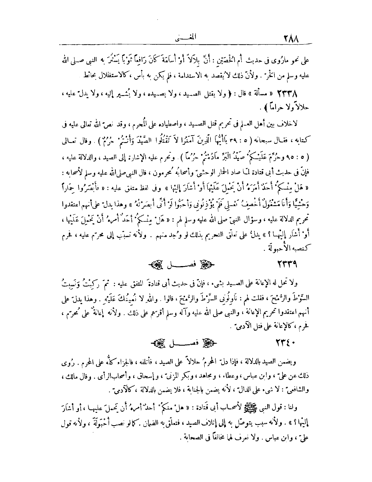 (٢٣٣٩) مَسْأَلَةٌ: قَالَ: (وَلَا يَقْتُلُ الصَّيْدَ، وَلَا يَصِيدُهُ، وَلَا يُشِيرُ إلَيْهِ، وَلَا يَدُلُّ عَلَيْهِ، حَلَالًا وَلَا حَرَامًا) لَا خِلَافَ بَيْنَ أَهْلِ الْعِلْمِ، فِي تَحْرِيمِ قَتْلِ الصَّيْدِ وَاصْطِيَادِهِ عَلَى الْمُحْرِمِ. وَقَدْ نَصَّ اللَّهُ تَعَالَى عَلَيْهِ فِي كِتَابِهِ، فَقَالَ سُبْحَانَهُ: {يَا أَيُّهَا الَّذِينَ آمَنُوا لا تَقْتُلُوا الصَّيْدَ وَأَنْتُمْ حُرُمٌ} [المائدة: ٩٥] .
