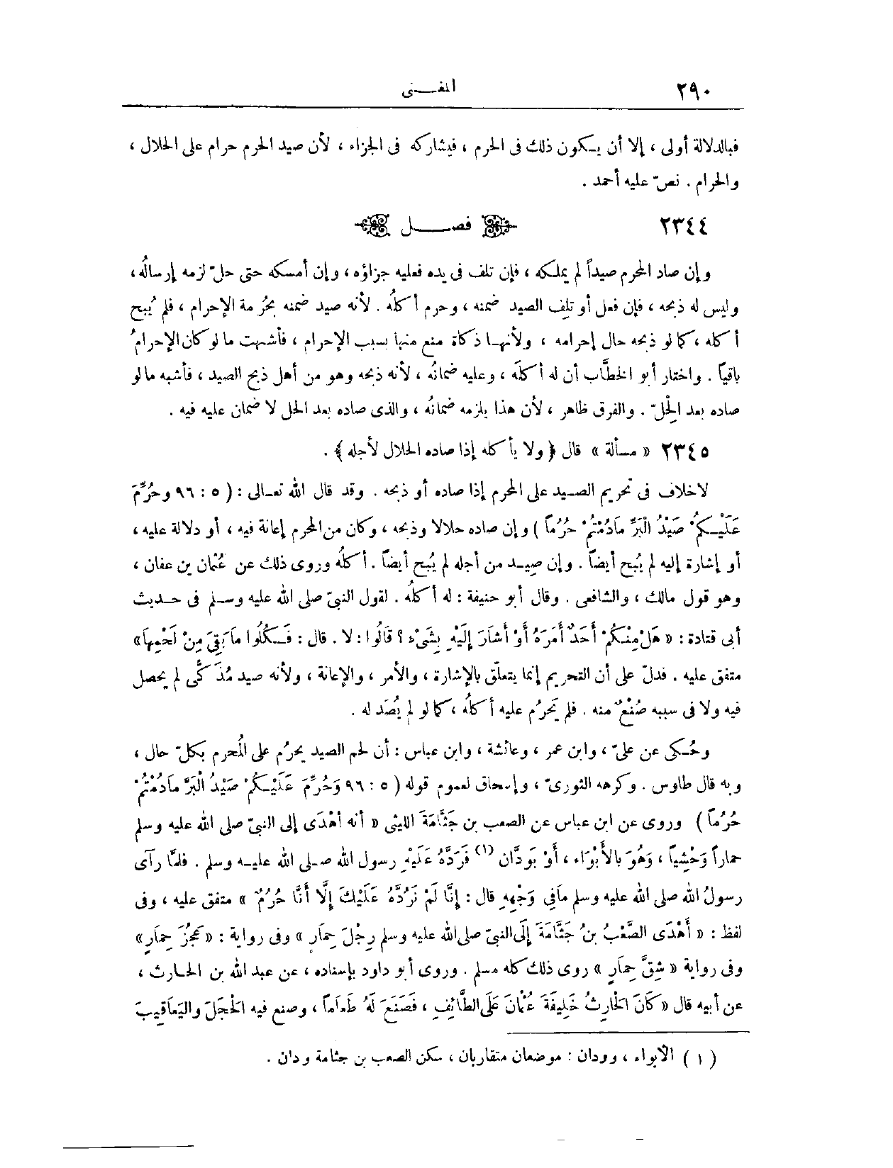 قَوْلِهِ: {وَحُرِّمَ عَلَيْكُمْ صَيْدُ الْبَرِّ مَا دُمْتُمْ حُرُمًا} [المائدة: ٩٦] . وَرُوِيَ عَنْ ابْنُ عَبَّاسٍ، عَنْ الصَّعْبِ بْنِ جَثَّامَةَ اللَّيْثِيِّ، أَنَّهُ «أَهْدَى إلَى النَّبِيِّ - صَلَّى اللَّهُ عَلَيْهِ وَسَلَّمَ - حِمَارًا وَحْشِيًّا، وَهُوَ بِالْأَبْوَاءِ أَوْ بِوَدَّانَ، فَرَدَّهُ عَلَيْهِ رَسُولُ اللَّهِ - صَلَّى اللَّهُ عَلَيْهِ وَسَلَّمَ - فَلَمَّا رَأَى رَسُولُ اللَّهِ - صَلَّى اللَّهُ عَلَيْهِ وَسَلَّمَ - مَا فِي وَجْهِهِ، قَالَ: إنَّا لَمْ نَرُدَّهُ عَلَيْك إلَّا أَنَّا حُرُمٌ» . مُتَّفَقٌ عَلَيْهِ. وَفِي لَفْظٍ: «أَهْدَى الصَّعْبُ بْنُ جَثَّامَةَ إلَى النَّبِيِّ - صَلَّى اللَّهُ عَلَيْهِ وَسَلَّمَ - رِجْلَ حِمَارٍ. وَفِي رِوَايَةٍ: عَجُزَ حِمَارٍ.» وَفِي رِوَايَةٍ: شِقَّ حِمَارٍ. رَوَى ذَلِكَ كُلَّهُ مُسْلِمٌ. وَرَوَى أَبُو دَاوُد، بِإِسْنَادِهِ عَنْ عَبْدِ اللَّهِ بْنِ الْحَارِثِ، عَنْ أَبِيهِ قَالَ: كَانَ الْحَارِثُ خَلِيفَةَ عُثْمَانَ عَلَى الطَّائِفِ، فَصَنَعَ لَهُ طَعَامًا، وَصَنَعَ فِيهِ مِنْ الْحَجَلِ وَالْيَعَاقِيبِ
