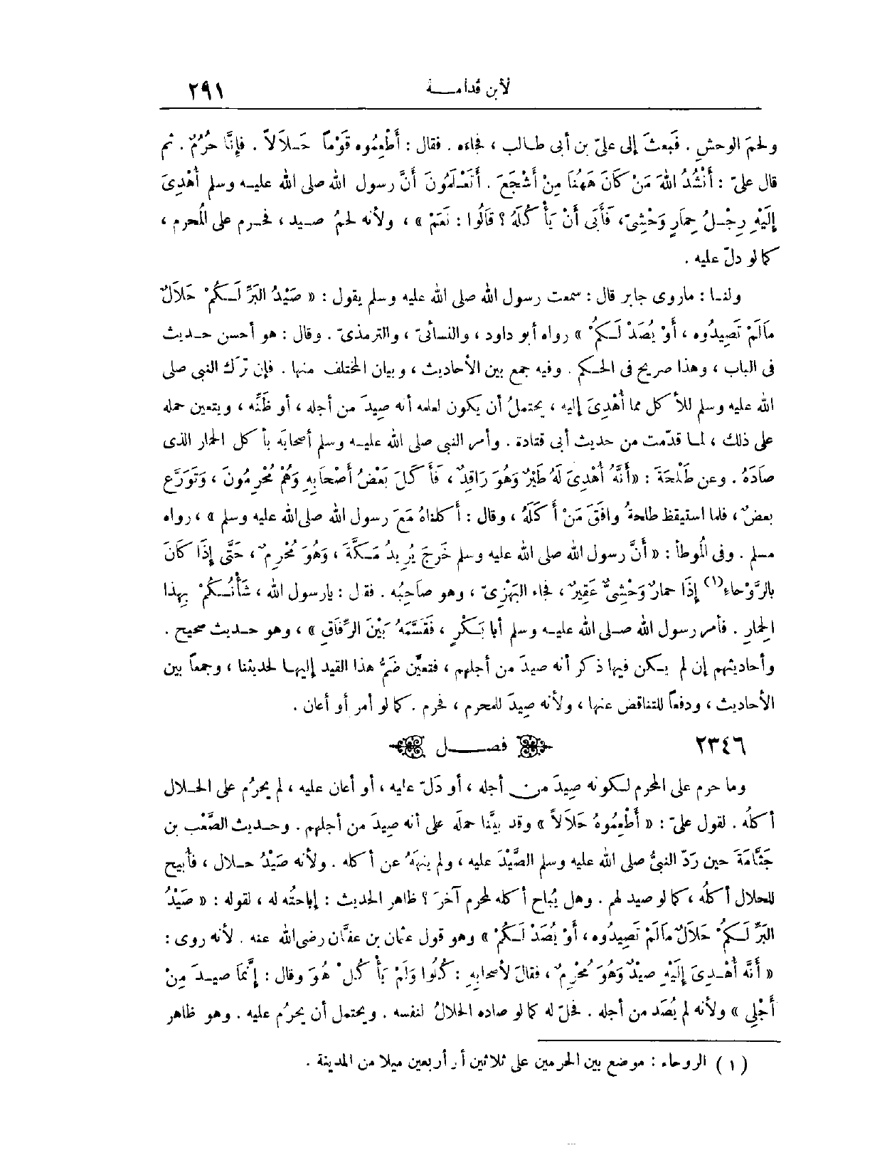 (٢٣٤٧) فَصْلٌ: وَمَا حَرُمَ عَلَى الْمُحْرِمِ، لِكَوْنِهِ صِيدَ مِنْ أَجْلِهِ، أَوْ دَلَّ عَلَيْهِ، أَوْ أَعَانَ عَلَيْهِ، لَمْ يَحْرُمْ عَلَى الْحَلَالِ أَكْلُهُ؛ لِقَوْلِ عَلِيٍّ، أَطْعِمُوهُ حَلَالًا. وَقَدْ بَيَّنَّا حَمْلَهُ عَلَى أَنَّهُ صِيدَ مِنْ أَجْلِهِمْ، وَحَدِيثِ الصَّعْبِ بْنِ جَثَّامَةَ، حِينَ رَدَّ النَّبِيُّ - صَلَّى اللَّهُ عَلَيْهِ وَسَلَّمَ - الصَّيْدَ عَلَيْهِ، وَلَمْ يَنْهَهُ عَنْ أَكْلِهِ. وَلِأَنَّهُ صَيْدٌ حَلَالٌ، فَأُبِيحَ لِلْحَلَالِ أَكْلُهُ، كَمَا لَوْ صِيدَ لَهُمْ. وَهَلْ يُبَاحُ أَكْلُهُ لِمُحْرِمٍ آخَرَ؟ ظَاهِرُ الْحَدِيثِ إبَاحَتُهُ لَهُ؛ لِقَوْلِهِ: «صَيْدُ الْبَرِّ لَكُمْ حَلَالٌ، مَا لَمْ تَصِيدُوهُ، أَوْ يُصَدْ لَكُمْ» . وَهُوَ قَوْلُ عُثْمَانَ بْنِ عَفَّانَ - رَضِيَ اللَّهُ عَنْهُ -؛ لِأَنَّهُ رُوِيَ أَنَّهُ أُهْدِيَ إلَيْهِ صَيْدٌ، وَهُوَ مُحْرِمٌ، فَقَالَ لِأَصْحَابِهِ: كُلُوا. وَلَمْ يَأْكُلْ هُوَ، وَقَالَ: إنَّمَا صِيدَ مِنْ أَجْلِي. وَلِأَنَّهُ لَمْ يُصَدْ مِنْ أَجْلِهِ، فَحَلَّ لَهُ كَمَا لَوْ صَادَهُ الْحَلَالُ لِنَفْسِهِ.