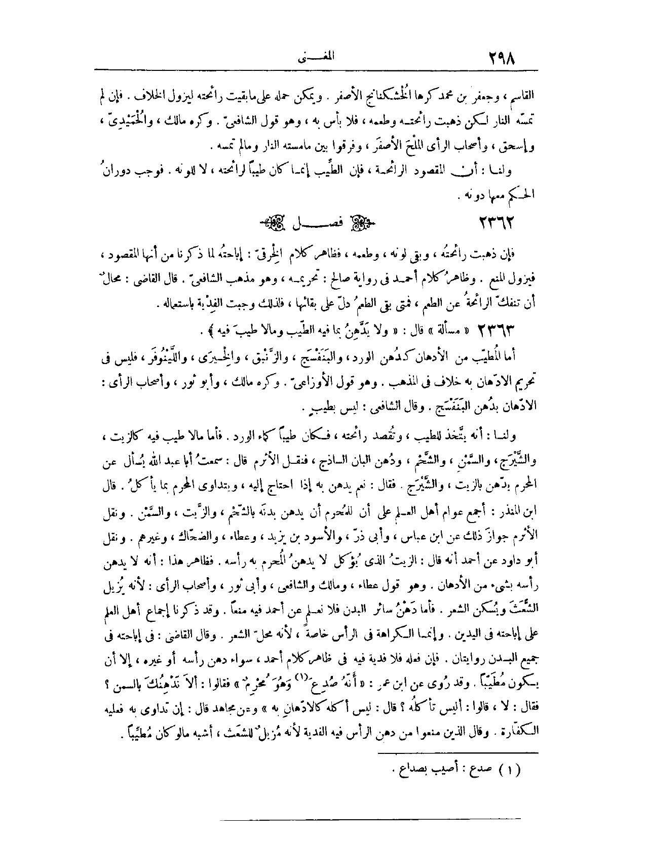 (٢٣٦٤) مَسْأَلَةٌ: قَالَ: (وَلَا يَدَّهِنُ بِمَا فِيهِ طِيبٌ، وَمَا لَا طِيبَ فِيهِ) أَمَّا الْمُطَيِّبُ مِنْ الْأَدْهَانِ، كَدُهْنِ الْوَرْدِ وَالْبَنَفْسَجِ وَالزَّنْبَقِ وَالْخَيْرِيِّ وَاللِّينُوفَرِ، فَلِيس فِي تَحْرِيمِ الِادِّهَانِ بِهِ خِلَافٌ فِي الْمَذْهَبِ. وَهُوَ قَوْلُ الْأَوْزَاعِيِّ. وَكَرِهَ مَالِكٌ، وَأَبُو ثَوْرٍ، وَأَصْحَابُ الرَّأْيِ، الِادِّهَانَ بِدُهْنِ الْبَنَفْسَجِ.