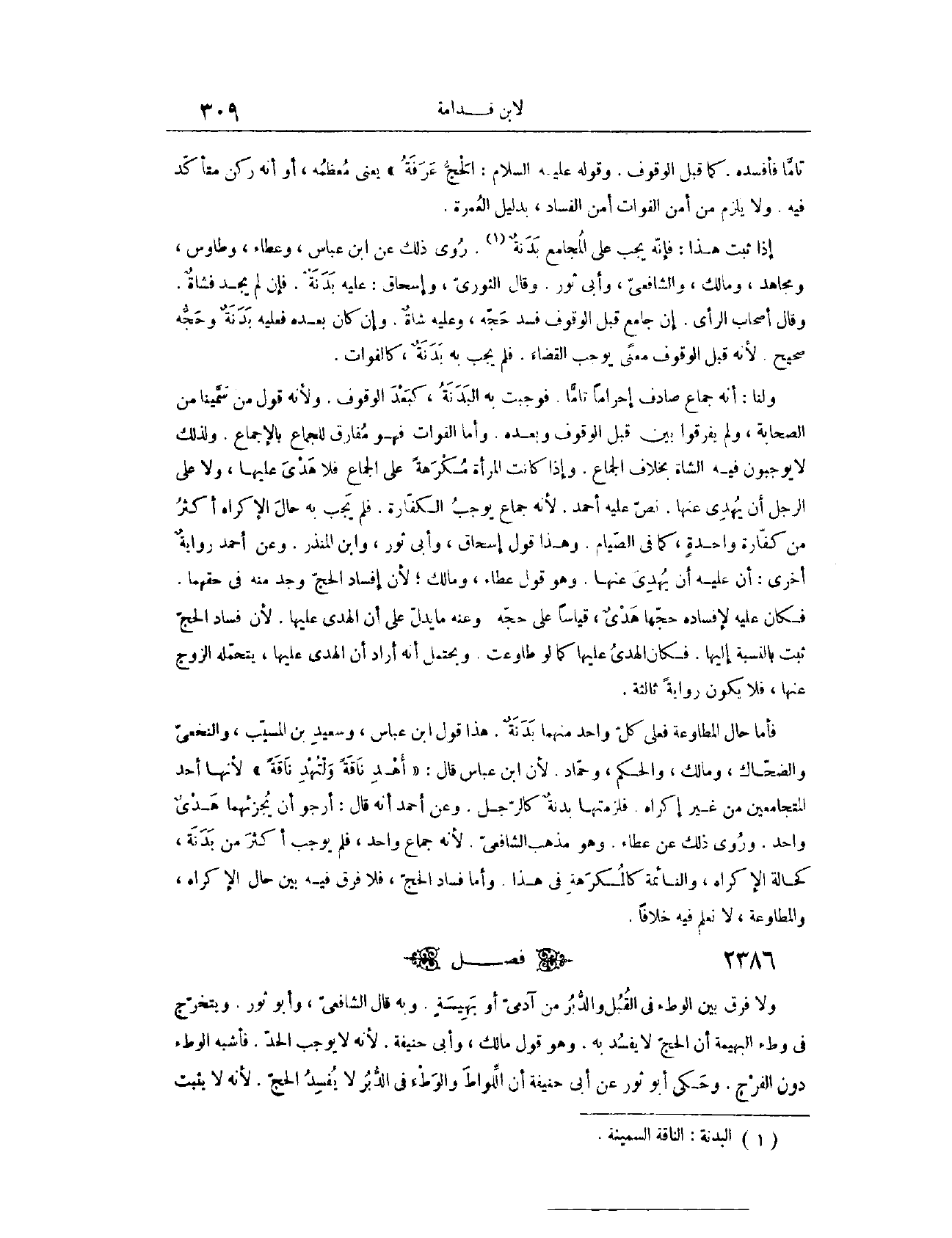 (٢٣٨٧) فَصْلٌ: وَلَا فَرْقَ بَيْنَ الْوَطْءِ فِي الْقُبُلِ وَالدُّبُرِ، مِنْ آدَمِيٍّ أَوْ بَهِيمَةٍ. وَبِهِ قَالَ الشَّافِعِيُّ، وَأَبُو ثَوْرٍ. وَيَتَخَرَّجُ فِي وَطْءِ الْبَهِيمَةِ أَنَّ الْحَجَّ لَا يَفْسُدُ بِهِ. وَهُوَ قَوْلُ مَالِكٍ، وَأَبِي حَنِيفَةَ؛ لِأَنَّهُ لَا يُوجِبُ الْحَدَّ، فَأَشْبَهَ الْوَطْءَ دُونَ الْفَرْجِ. وَحَكَى أَبُو ثَوْرٍ عَنْ أَبِي حَنِيفَةَ أَنَّ اللِّوَاطَ وَالْوَطْءَ فِي الدُّبُرِ لَا يُفْسِدُ الْحَجَّ؛ لِأَنَّهُ لَا يَثْبُتُ