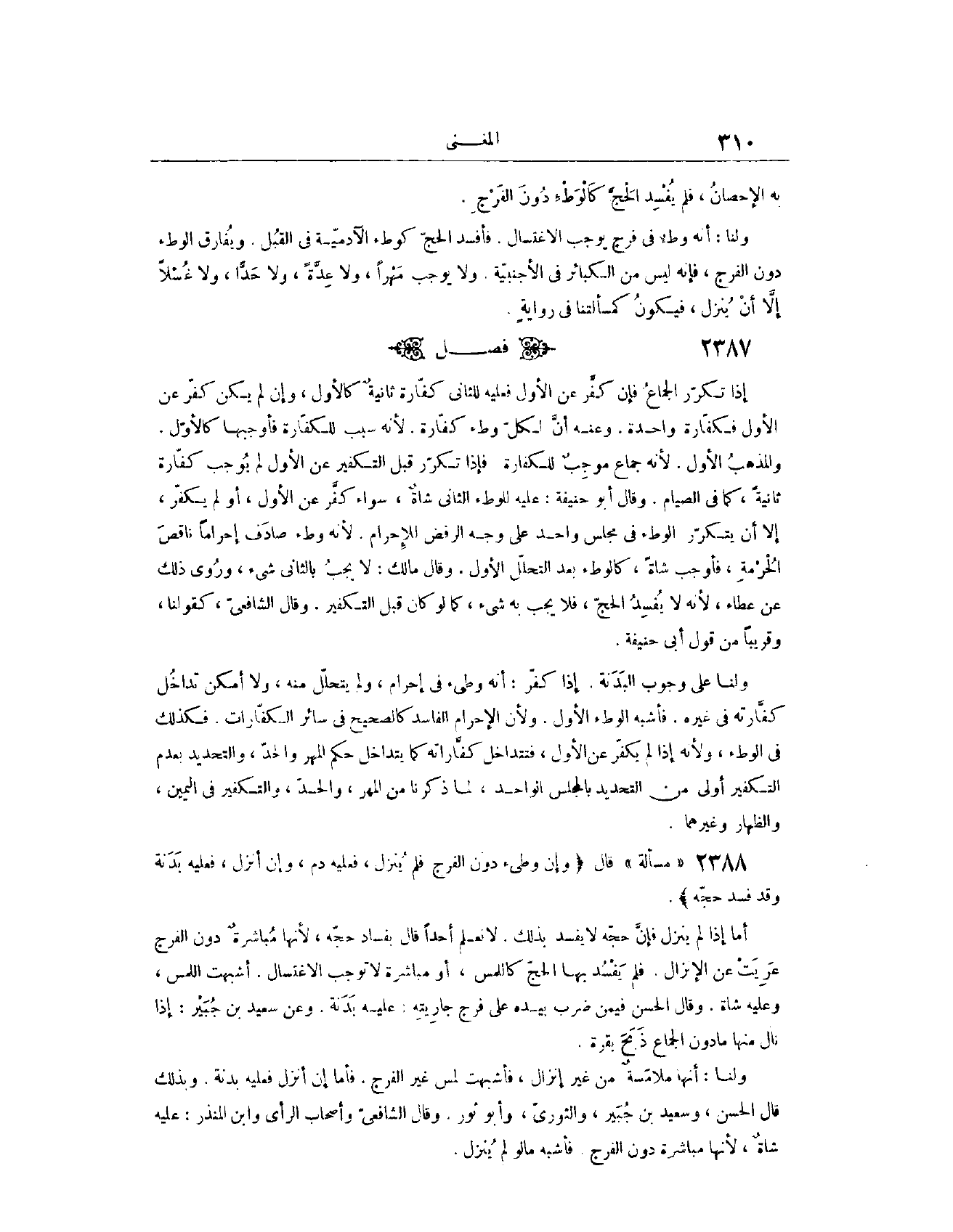 (٢٣٨٩) مَسْأَلَةٌ: قَالَ: (وَإِنْ وَطِئَ دُونَ الْفَرْجِ، فَلَمْ يُنْزِلْ فَعَلَيْهِ دَمٌ، وَإِنْ أَنْزَلَ فَعَلَيْهِ بَدَنَةٌ، وَقَدْ فَسَدَ حَجُّهُ) أَمَّا إذَا لَمْ يُنْزِلْ، فَإِنَّ حَجَّهُ لَا يَفْسُدُ بِذَلِكَ. لَا نَعْلَمُ أَحَدًا قَالَ بِفَسَادِ حَجِّهِ؛ لِأَنَّهَا مُبَاشَرَةٌ دُونَ الْفَرْجِ عَرِيَتْ عَنْ الْإِنْزَالِ، فَلَمْ يَفْسُدْ بِهَا الْحَجُّ، كَاللَّمْسِ، أَوْ مُبَاشَرَةٌ لَا تُوجِبُ الِاغْتِسَالَ، أَشْبَهَتْ اللَّمْسَ، وَعَلَيْهِ شَاةٌ.