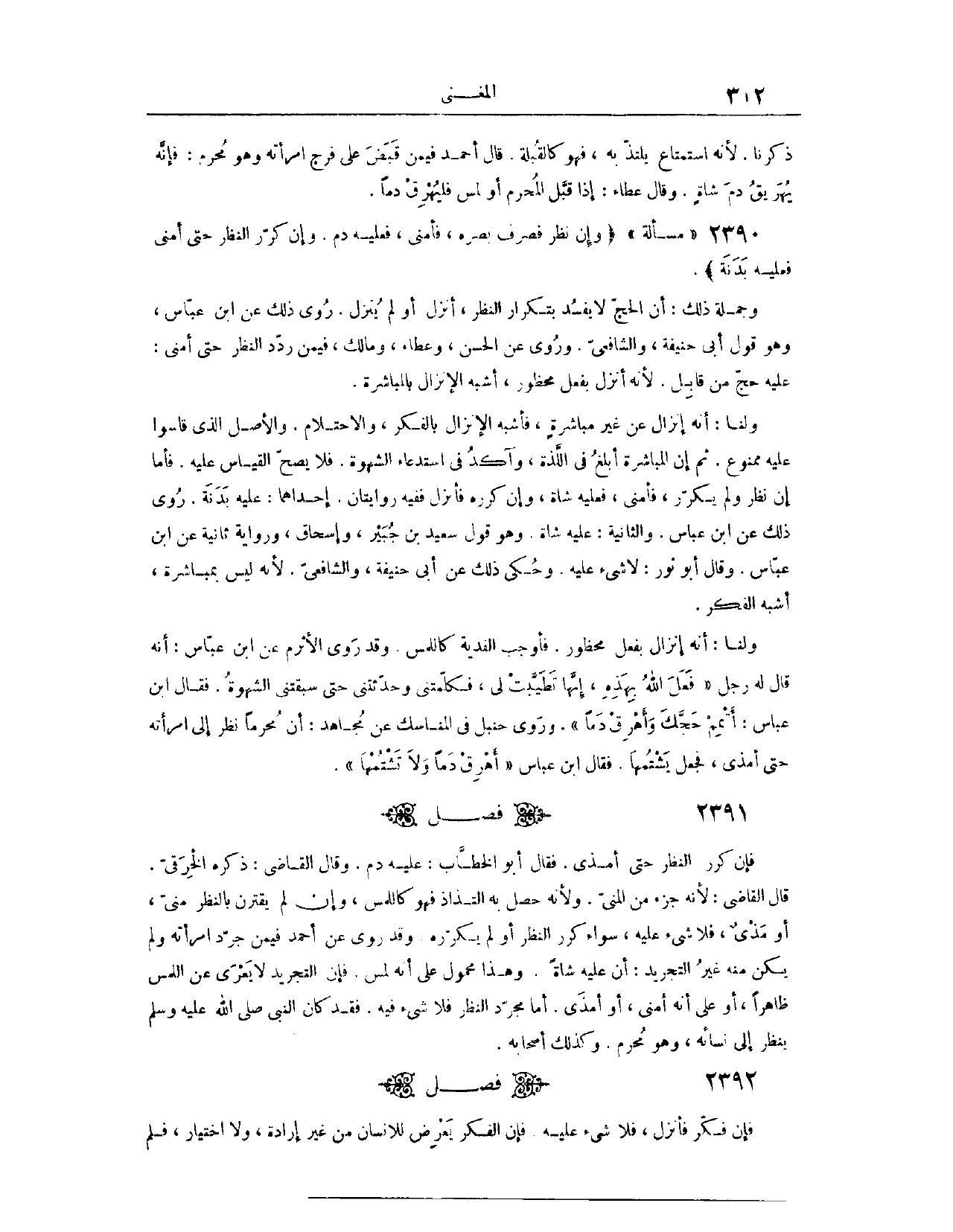 (٢٣٩١) مَسْأَلَة: قَالَ: (وَإِنْ نَظَرَ، فَصَرَفَ بَصَرَهُ، فَأَمْنَى، فَعَلَيْهِ دَمٌ، وَإِنْ كَرَّرَ النَّظَرَ حَتَّى أَمْنَى، فَعَلَيْهِ بَدَنَةٌ) وَجُمْلَةُ ذَلِكَ، أَنَّ الْحَجَّ لَا يَفْسُدُ بِتَكْرَارِ النَّظَرِ، أَنْزَلَ أَوْ لَمْ يُنْزِلْ. رُوِيَ ذَلِكَ عَنْ ابْنِ عَبَّاسٍ. وَهُوَ قَوْلُ أَبِي حَنِيفَةَ، وَالشَّافِعِيِّ. وَرُوِيَ عَنْ الْحَسَنِ، وَعَطَاءٍ، وَمَالِكٍ، فِي مَنْ رَدَّدَ النَّظَرَ حَتَّى أَمْنَى: عَلَيْهِ حَجٌّ قَابِلٍ؛ لِأَنَّهُ أَنْزَلَ بِفِعْلِ مَحْظُورٍ، أَشْبَهَ الْإِنْزَالَ بِالْمُبَاشَرَةِ.