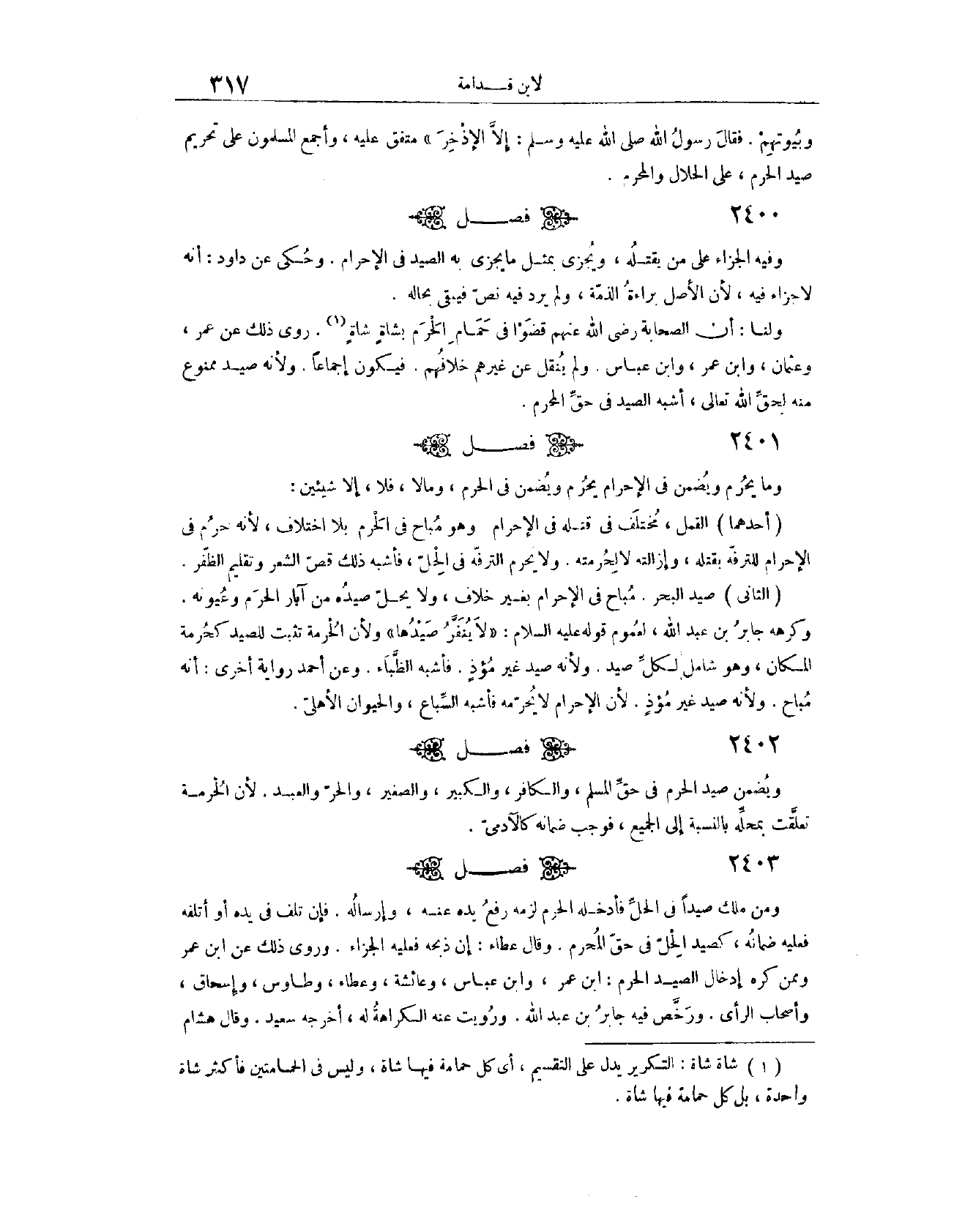 (٢٤٠٢) فَصْلٌ: وَمَا يُحَرَّمُ وَيُضْمَنُ فِي الْإِحْرَامِ يُحَرَّمُ وَيُضْمَنُ فِي الْحَرَمِ، وَمَا لَا فَلَا، إلَّا شَيْئَيْنِ؛ أَحَدُهُمَا، الْقَمْلُ. مُخْتَلَفٌ فِي قَتْلِهِ فِي الْإِحْرَامِ، وَهُوَ مُبَاحٌ فِي الْحَرَمِ بِلَا اخْتِلَافٍ؛ لِأَنَّهُ حُرِّمَ فِي الْإِحْرَامِ لِلتَّرَفُّهِ بِقَتْلِهِ وَإِزَالَتِهِ، لَا لِحُرْمَتِهِ، وَلَا يُحَرَّمُ التَّرَفُّهُ فِي الْحِلِّ، فَأَشْبَهَ ذَلِكَ قَصَّ الشَّعْرِ وَتَقْلِيمَ الظُّفْرِ. الثَّانِي، صَيْدُ الْبَحْرِ. مُبَاحٌ فِي الْإِحْرَام بِغَيْرِ خِلَافٍ، وَلَا يَحِلُّ صَيْدُهُ مِنْ آبَارِ الْحَرَمِ وَعُيُونِهِ.