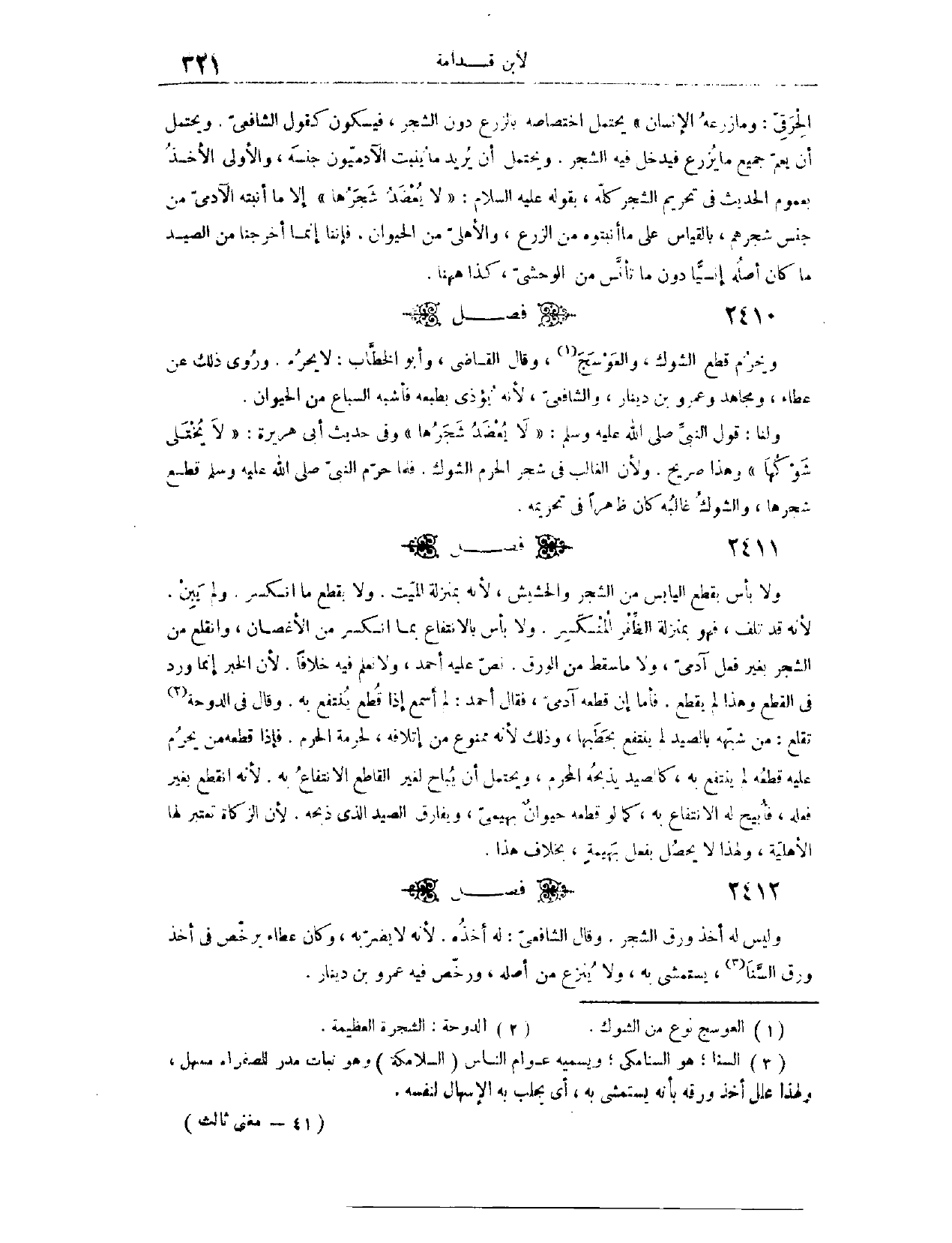 (٢٤١١) فَصْلٌ: وَيَحْرُمُ قَطْعُ الشَّوْكِ، وَالْعَوْسَجِ. وَقَالَ الْقَاضِي، وَأَبُو الْخَطَّابِ: لَا يَحْرُمُ. وَرُوِيَ ذَلِكَ عَنْ عَطَاءٍ، وَمُجَاهِدٍ، وَعَمْرِو بْنِ دِينَارٍ، وَالشَّافِعِيِّ؛ لِأَنَّهُ يُؤْذِي بِطَبْعِهِ، فَأَشْبَهَ السِّبَاعَ مِنْ الْحَيَوَانِ.