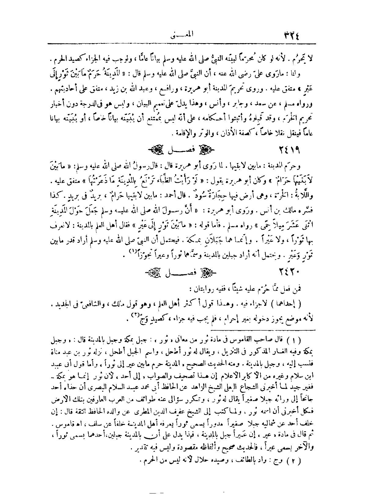 (٢٤٢٠) فَصْلٌ: وَحَرَمُ الْمَدِينَةِ مَا بَيْنَ لَابَتَيْهَا؛ لِمَا رَوَى أَبُو هُرَيْرَةَ قَالَ: قَالَ رَسُولُ اللَّهِ - صَلَّى اللَّهُ عَلَيْهِ وَسَلَّمَ -: «مَا بَيْنَ لَابَتَيْهَا حَرَامٌ. وَكَانَ أَبُو هُرَيْرَةَ يَقُول: لَوْ رَأَيْت الظِّبَاءَ تَرْتَعُ بِالْمَدِينَةِ مَا ذَعَرْتهَا» . مُتَّفَقٌ عَلَيْهِ. وَاللَّابَةُ: الْحَرَّةُ، وَهِيَ أَرْضٌ فِيهَا حِجَارَةٌ سُودٌ. قَالَ أَحْمَدُ: مَا بَيْنَ لَابَتَيْهَا حَرَامٌ. بَرِيدٌ فِي بَرِيدٍ، كَذَا فَسَّرَهُ مَالِكُ بْنُ أَنَسٍ. وَرَوَى أَبُو هُرَيْرَةَ، «أَنَّ رَسُولَ اللَّهِ - صَلَّى اللَّهُ عَلَيْهِ وَسَلَّمَ - جَعَلَ حَوْلَ الْمَدِينَةِ اثْنَا عَشَرِ مِيلًا حِمًى» . رَوَاهُ مُسْلِمٌ.