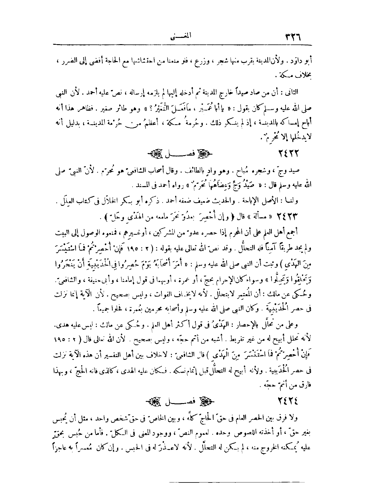 (٢٤٢٣) فَصْلٌ: صَيْدُ وَجٍّ وَشَجَرُهُ مُبَاحٌ؛ وَهُوَ وَادٍ بِالطَّائِفِ. وَقَالَ أَصْحَابُ الشَّافِعِيِّ: هُوَ مُحَرَّمٌ؛ لِأَنَّ النَّبِيَّ - صَلَّى اللَّهُ عَلَيْهِ وَسَلَّمَ - قَالَ: «صَيْدُ وَجٍّ وَعِضَاهُهَا مُحَرَّمٌ» . رَوَاهُ أَحْمَدُ، فِي (الْمُسْنَدِ) . وَلَنَا، أَنَّ الْأَصْلَ الْإِبَاحَةُ، وَالْحَدِيثُ ضَعِيفٌ، ضَعَّفَهُ أَحْمَدُ. ذَكَرَهُ أَبُو بَكْرٍ الْخَلَّالُ، فِي كِتَابِ (الْعِلَلِ) .