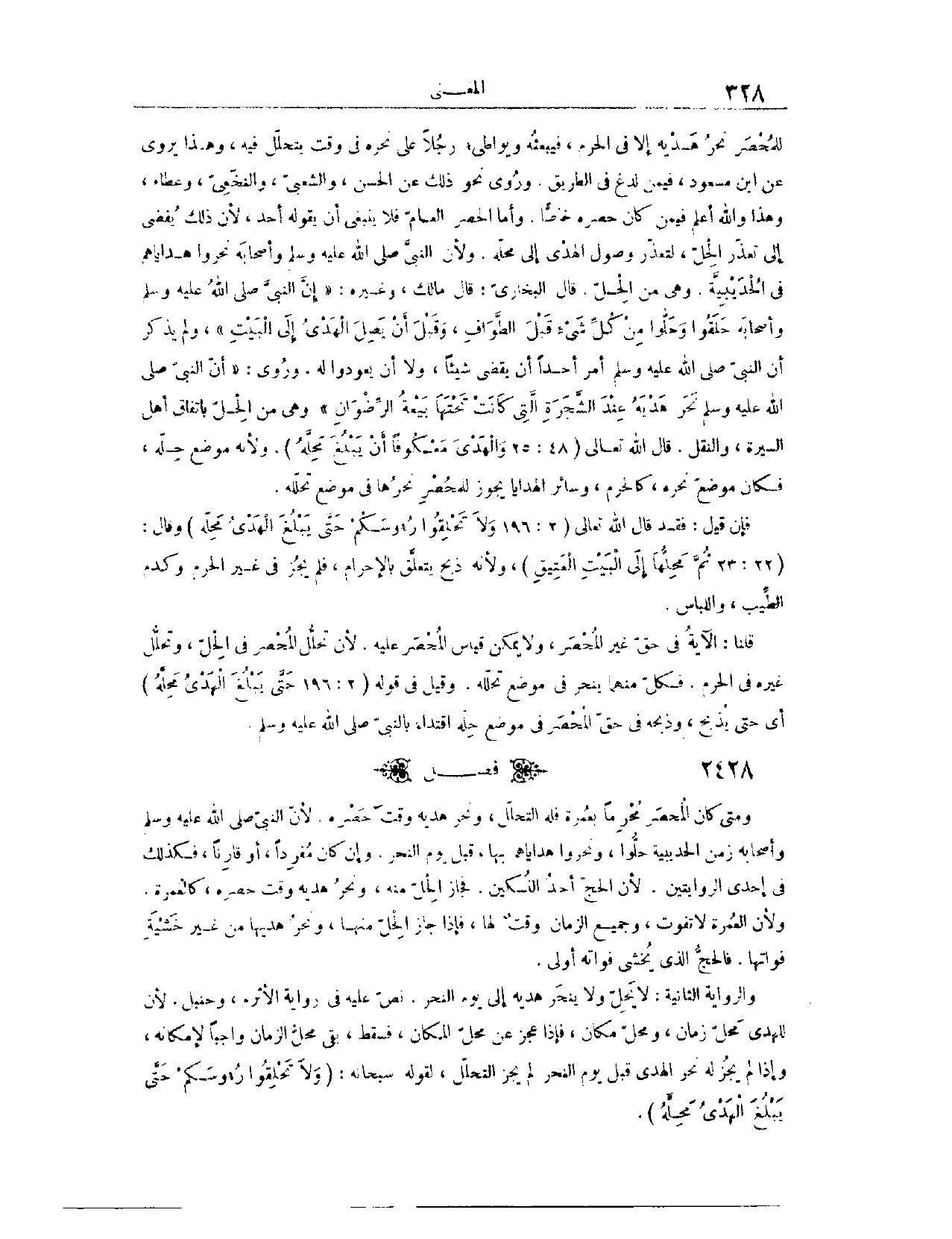 (٢٤٢٩) فَصْلٌ: وَمَتَى كَانَ الْمُحْصَرُ مُحْرِمًا بِعُمْرَةٍ، فَلَهُ التَّحَلُّلُ وَنَحْرُ هَدْيِهِ وَقْتَ حَصْرِهِ؛ لِأَنَّ النَّبِيَّ - صَلَّى اللَّهُ عَلَيْهِ وَسَلَّمَ - وَأَصْحَابَهُ زَمَنَ الْحُدَيْبِيَةِ، حَلُّوا وَنَحَرُوا هَدَايَاهُمْ بِهَا قَبْلَ يَوْمِ النَّحْرِ. وَإِنْ كَانَ مُفْرِدًا أَوْ قَارِنًا، فَكَذَلِكَ فِي إحْدَى الرِّوَايَتَيْنِ؛ لِأَنَّ الْحَجَّ أَحَدُ النُّسُكَيْنِ، فَجَازَ الْحِلُّ مِنْهُ وَنَحْرُ هَدْيِهِ وَقْتَ حَصْرِهِ، كَالْعُمْرَةِ، وَلِأَنَّ الْعُمْرَةَ لَا تَفُوتُ، وَجَمِيعُ الزَّمَانِ وَقْتٌ لَهَا، فَإِذَا جَازَ الْحِلُّ مِنْهَا وَنَحْرُ هَدْيِهَا مِنْ غَيْرِ خَشْيَةِ فَوَاتِهَا، فَالْحَجُّ الَّذِي يُخْشَى فَوَاتُهُ أَوْلَى.