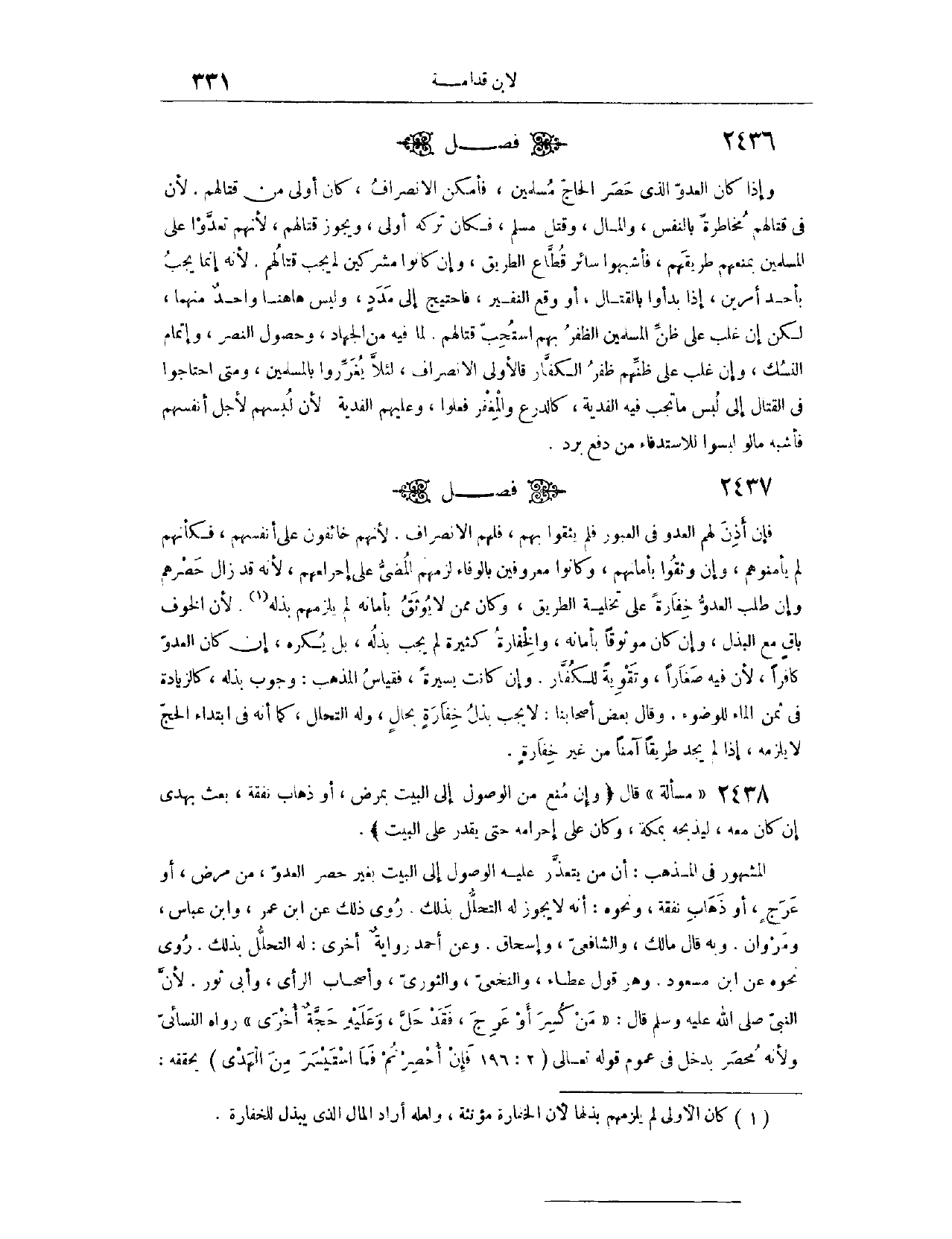 (٢٤٣٧) فَصْلٌ: وَإِذَا كَانَ الْعَدُوُّ الَّذِي حَصَرَ الْحَاجَّ مُسْلِمِينَ، فَأَمْكَنَ الِانْصِرَافُ، كَانَ أَوْلَى مِنْ قِتَالِهِمْ؛ لِأَنَّ فِي قِتَالِهِمْ مُخَاطَرَةً بِالنَّفْسِ وَالْمَالِ وَقَتْلَ مُسْلِمٍ، فَكَانَ تَرْكُهُ أَوْلَى. وَيَجُوزُ قِتَالُهُمْ؛ لِأَنَّهُمْ تَعُدُّوا عَلَى الْمُسْلِمِينَ بِمَنْعِهِمْ طَرِيقَهُمْ، فَأَشْبَهُوا سَائِرَ قُطَّاعِ الطَّرِيقِ. وَإِنْ كَانُوا مُشْرِكِينَ، لَمْ يَجِبْ قِتَالُهُمْ؛ لِأَنَّهُ إنَّمَا يَجِبُ بِأَحَدِ أَمْرَيْنِ؛ إذَا بَدَءُوا بِالْقِتَالِ، أَوْ وَقَعَ النَّفِيرُ فَاحْتِيجَ إلَى مَدَدٍ؛ وَلَيْسَ هَاهُنَا وَاحِدٌ مِنْهُمَا.