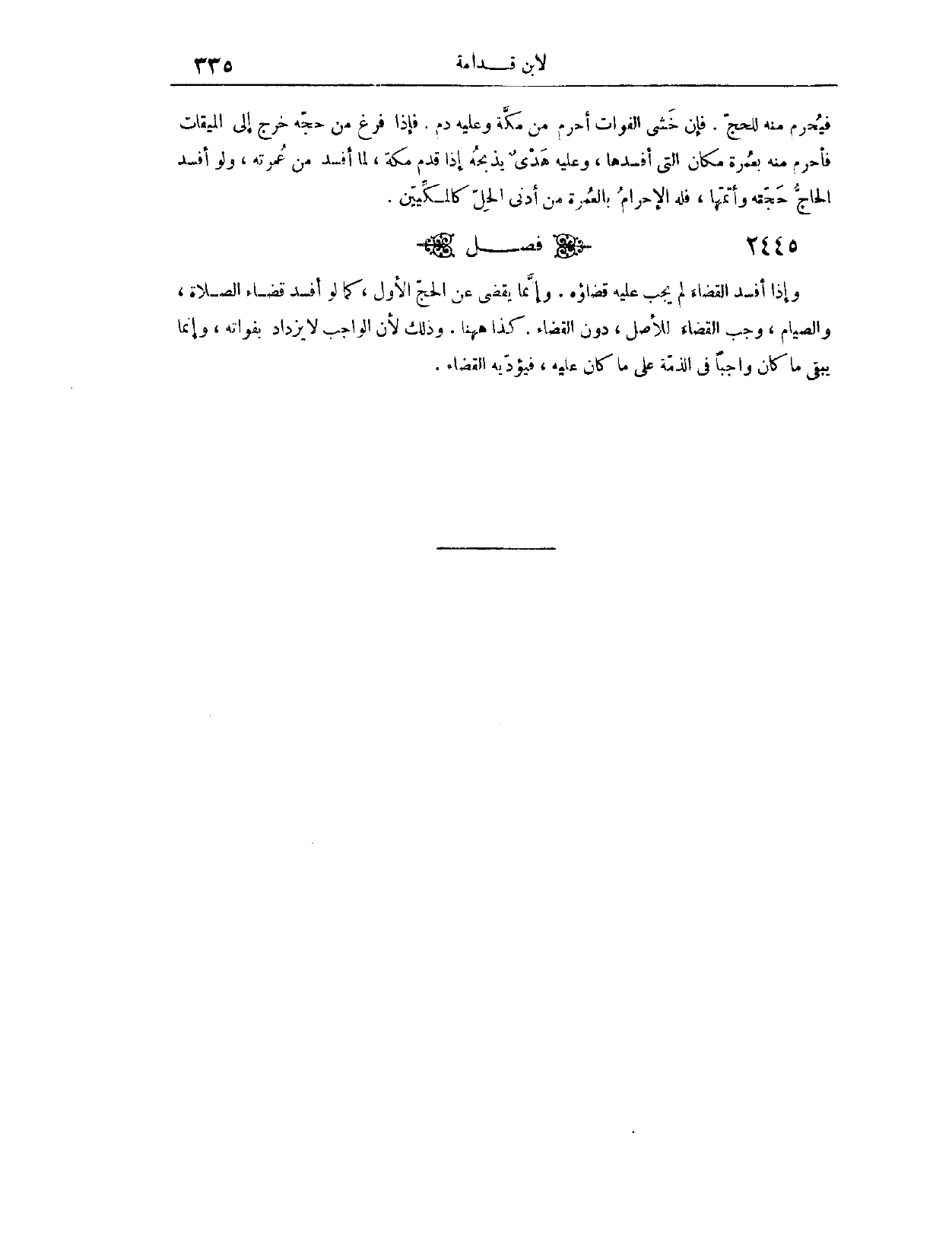 وَلَوْ أَفْسَدَ الْحَاجُّ حَجَّتَهُ، وَأَتَمَّهَا، فَلَهُ الْإِحْرَامُ بِالْعُمْرَةِ مِنْ أَدْنَى الْحِلِّ، كَالْمَكِّيِّينَ. (٢٤٤٦) فَصْلٌ: وَإِذَا أَفْسَدَ الْقَضَاءَ، لَمْ يَجِبْ عَلَيْهِ قَضَاؤُهُ، وَإِنَّمَا يَقْضِي عَنْ الْحَجِّ الْأَوَّلِ، كَمَا لَوْ أَفْسَدَ قَضَاءَ الصَّلَاةِ وَالصِّيَامِ، وَجَبَ الْقَضَاءُ لِلْأَصْلِ، دُونَ الْقَضَاءِ، كَذَا هَاهُنَا؛ وَذَلِكَ لِأَنَّ الْوَاجِبَ لَا يَزْدَادُ بِفَوَاتِهِ، وَإِنَّمَا يَبْقَى مَا كَانَ وَاجِبًا فِي الذِّمَّةِ عَلَى مَا كَانَ عَلَيْهِ، فَيُؤَدِّيهِ الْقَضَاءُ.
