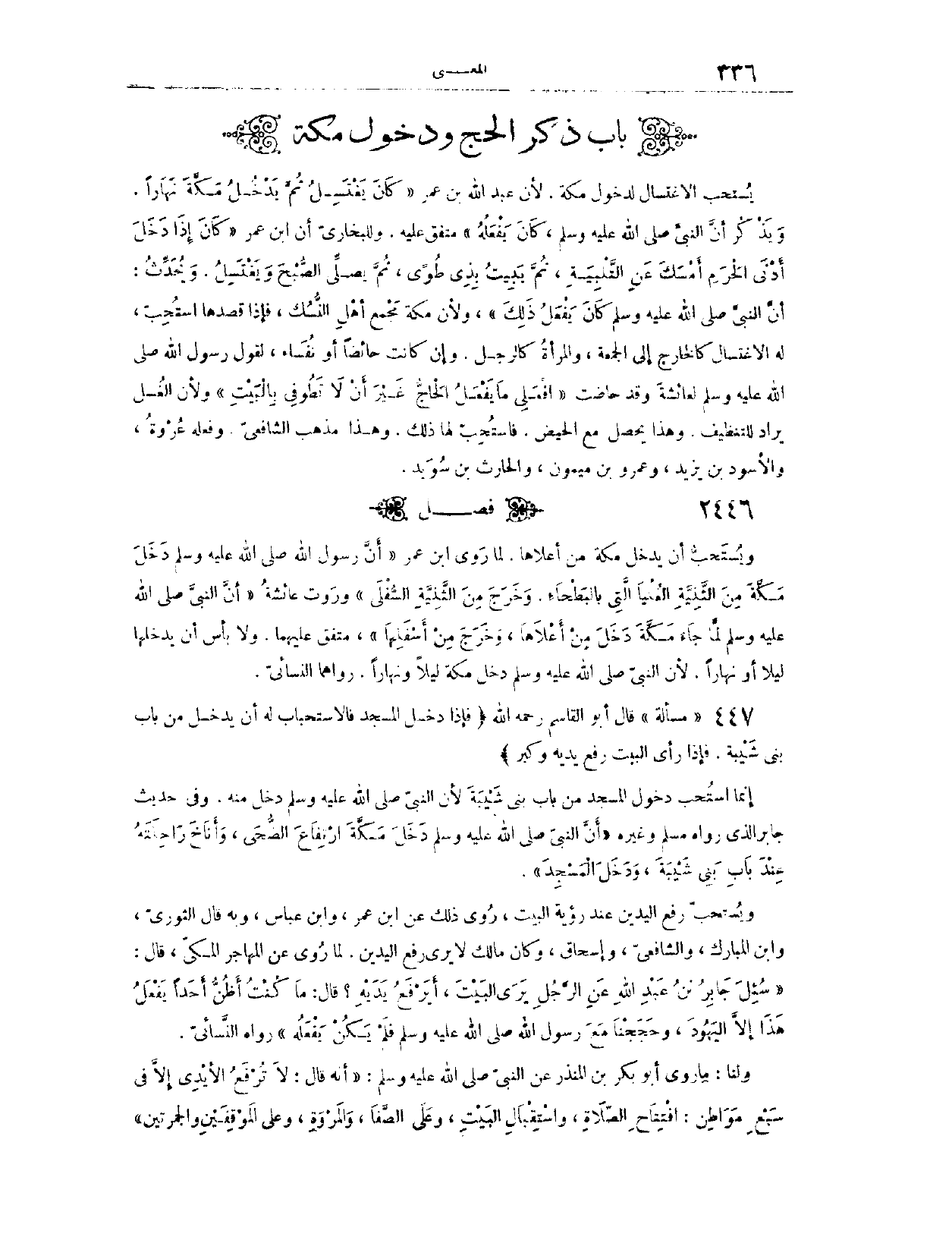 (٢٤٤٨) مَسْأَلَةٌ: قَالَ: أَبُو الْقَاسِمِ، - رَحِمَهُ اللَّهُ -: (فَإِذَا دَخَلَ الْمَسْجِدَ، فَالِاسْتِحْبَابُ لَهُ أَنْ يَدْخُلَ مِنْ بَابِ بَنِي شَيْبَةَ، فَإِذَا رَأَى الْبَيْتَ رَفَعَ يَدَيْهِ وَكَبَّرَ) إنَّمَا اُسْتُحِبَّ دُخُولُ الْمَسْجِدِ مِنْ بَابِ بَنِي شَيْبَةَ؛ لِأَنَّ النَّبِيَّ - صَلَّى اللَّهُ عَلَيْهِ وَسَلَّمَ - دَخَلَ مِنْهُ، وَفِي حَدِيثِ جَابِرٍ، الَّذِي رَوَاهُ مُسْلِمٌ وَغَيْرُهُ، «أَنَّ النَّبِيَّ - صَلَّى اللَّهُ عَلَيْهِ وَسَلَّمَ - دَخَلَ مَكَّةَ ارْتِفَاعَ الضُّحَى، وَأَنَاخَ رَاحِلَتَهُ عِنْدَ بَابِ بَنِي شَيْبَةَ، وَدَخَلَ الْمَسْجِدَ» . وَيُسْتَحَبُّ رَفْعُ الْيَدَيْنِ عِنْدَ رُؤْيَةِ الْبَيْتِ. رُوِيَ ذَلِكَ عَنْ ابْنِ عُمَرَ، وَابْنِ عَبَّاسٍ. وَبِهِ قَالَ الثَّوْرِيُّ، وَابْنُ الْمُبَارَكِ، وَالشَّافِعِيُّ، وَإِسْحَاقُ.