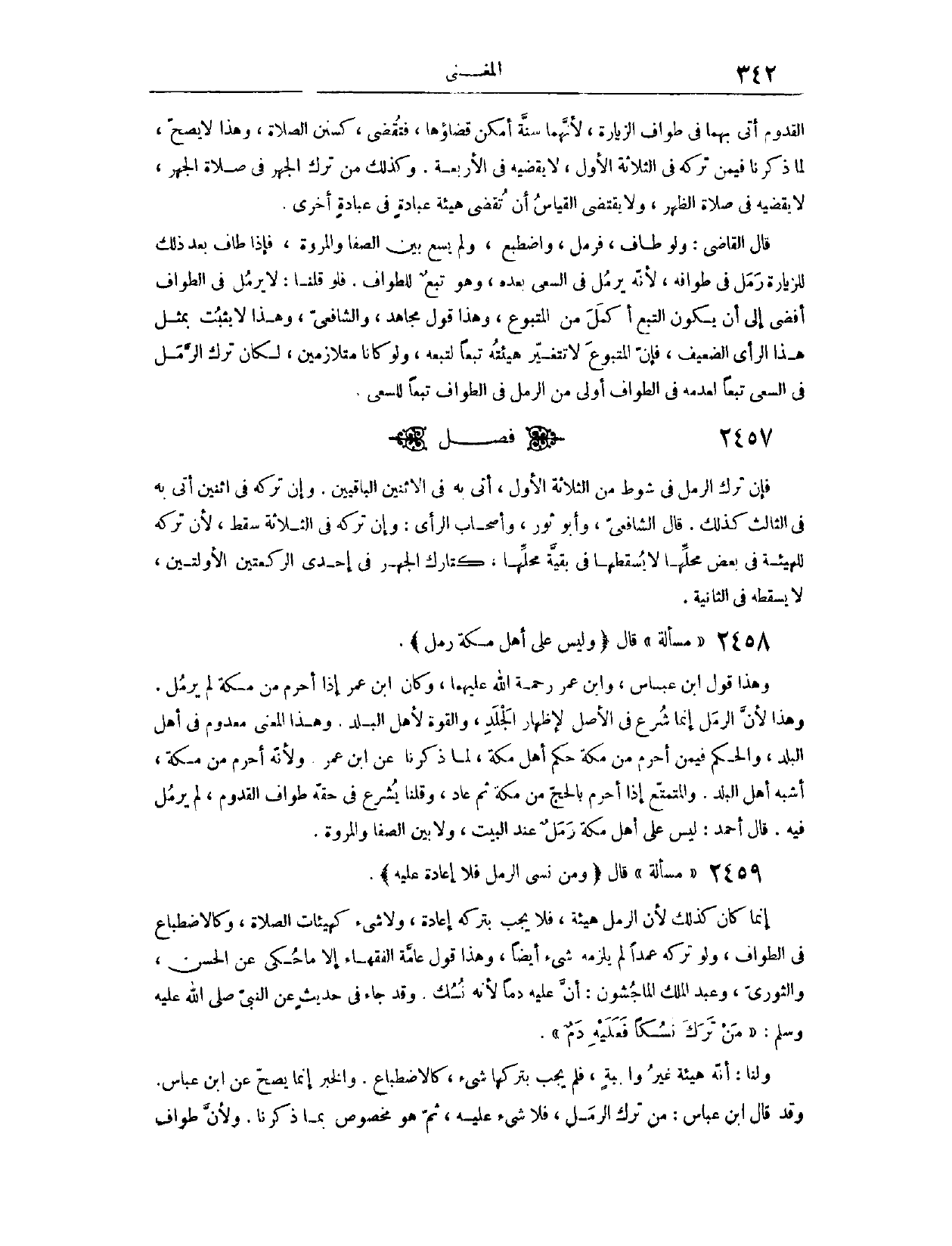 (٢٤٥٨) فَصْلٌ: فَإِنْ تَرَكَ الرَّمَلَ فِي شَوْطٍ مِنْ الثَّلَاثَةِ الْأُوَلِ، أَتَى بِهِ فِي الِاثْنَيْنِ الْبَاقِيَيْنِ. وَإِنْ تَرَكَهُ فِي اثْنَيْنِ أَتَى بِهِ فِي الثَّالِثِ. وَإِنْ تَرَكَهُ فِي الثَّلَاثَةِ سَقَطَ. كَذَلِكَ قَالَ الشَّافِعِيُّ، وَأَبُو ثَوْرٍ، وَأَصْحَابُ الرَّأْيِ؛ لِأَنَّ تَرْكَهُ لِلْهَيْئَةِ فِي بَعْضِ مَحِلِّهَا لَا يُسْقِطُهَا فِي بَقِيَّةِ مَحِلِّهَا، كَتَارِكِ الْجَهْرِ فِي إحْدَى الرَّكْعَتَيْنِ الْأُولَتَيْنِ، لَا يُسْقِطُهُ فِي الثَّانِيَةِ.
