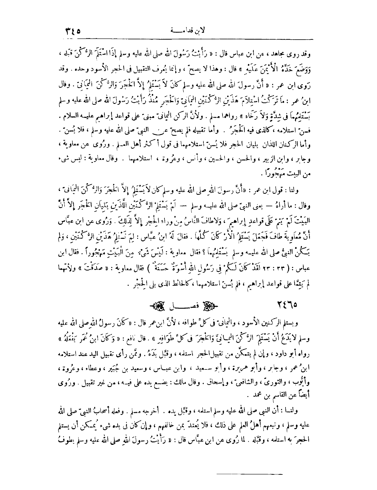 وَرُوِيَ عَنْ ابْنِ عَبَّاسٍ، أَنَّ مُعَاوِيَةَ طَافَ، فَجَعَلَ يَسْتَلِمُ الْأَرْكَانَ كُلَّهَا، فَقَالَ لَهُ ابْنُ عَبَّاسٍ: لِمَ تَسْتَلِمُ هَذَيْنِ الرُّكْنَيْنِ، وَلَمْ يَكُنْ النَّبِيُّ - صَلَّى اللَّهُ عَلَيْهِ وَسَلَّمَ - يَسْتَلِمُهُمَا؟ فَقَالَ مُعَاوِيَةُ لَيْسَ شَيْءٌ مِنْ الْبَيْتِ مَهْجُورًا. فَقَالَ ابْنُ عَبَّاسٍ: {لَقَدْ كَانَ لَكُمْ فِي رَسُولِ اللَّهِ أُسْوَةٌ حَسَنَةٌ} [الأحزاب: ٢١] . فَقَالَ مُعَاوِيَةُ: صَدَقْت. وَلِأَنَّهُمَا لَمْ يَتِمَّا عَلَى قَوَاعِدِ إبْرَاهِيمَ، فَلَمْ يُسَنَّ اسْتِلَامُهُمَا، كَالْحَائِطِ الَّذِي يَلِي الْحِجْرَ.