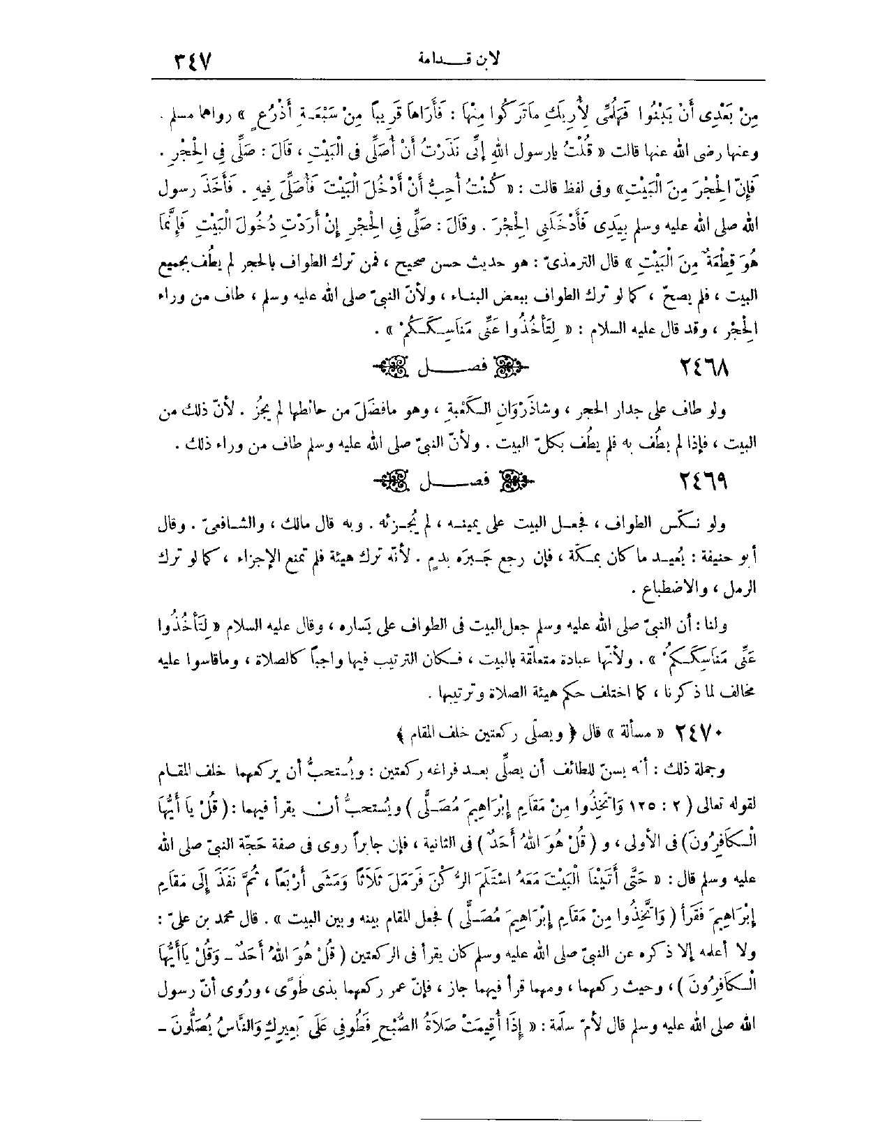 مِنْ بَعْدِي أَنْ يَبْنُوا، فَهَلُمِّي لِأُرِيَك مَا تَرَكُوا مِنْهَا. فَأَرَاهَا قَرِيبًا مِنْ سَبْعَةِ أَذْرُعٍ» رَوَاهُمَا مُسْلِمٌ. وَعَنْهَا - رَضِيَ اللَّهُ عَنْهُ - قَالَتْ: «قُلْت يَا رَسُولَ اللَّهِ، إنِّي نَذَرْت أَنْ أُصَلِّيَ فِي الْبَيْتِ. قَالَ: صَلِّي فِي الْحِجْرِ، فَإِنَّ الْحِجْرَ مِنْ الْبَيْتِ. وَفِي لَفْظٍ، قَالَتْ: كُنْت أُحِبُّ أَنْ أَدْخُلَ الْبَيْتَ، فَأُصَلِّيَ فِيهِ، فَأَخَذَ رَسُولُ اللَّهِ - صَلَّى اللَّهُ عَلَيْهِ وَسَلَّمَ - بِيَدِي، فَأَدْخَلَنِي الْحِجْرَ، وَقَالَ: صَلِّي فِي الْحِجْرِ إنْ أَرَدْت دُخُولَ الْبَيْتِ، فَإِنَّمَا هُوَ قِطْعَةٌ مِنْ الْبَيْتِ» قَالَ التِّرْمِذِيُّ: هُوَ حَدِيثٌ حَسَنٌ صَحِيحٌ. فَمَنْ تَرَكَ الطَّوَافَ بِالْحِجْرِ لَمْ يَطُفْ بِجَمِيعِ الْبَيْتِ، فَلَمْ يَصِحَّ، كَمَا لَوْ تَرَكَ الطَّوَافَ بِبَعْضِ الْبِنَاءِ، وَلِأَنَّ النَّبِيَّ - صَلَّى اللَّهُ عَلَيْهِ وَسَلَّمَ - طَافَ مِنْ وَرَاءِ الْحِجْرِ، وَقَدْ قَالَ - عَلَيْهِ السَّلَامُ -: «لِتَأْخُذُوا عَنِّي مَنَاسِكَكُمْ» . (٢٤٦٩) فَصْلٌ: وَلَوْ طَافَ عَلَى جِدَارِ الْحِجْرِ، وَشَاذَرْوَانِ الْكَعْبَةِ، وَهُوَ مَا فَضَلَ مِنْ حَائِطِهَا، لَمْ يَجُزْ؛ لِأَنَّ ذَلِكَ مِنْ الْبَيْتِ، فَإِذَا لَمْ يَطُفْ بِهِ، فَلَمْ يَطُفْ بِكُلِّ الْبَيْتِ؛ وَلِأَنَّ النَّبِيَّ - صَلَّى اللَّهُ عَلَيْهِ وَسَلَّمَ - طَافَ مِنْ وَرَاءِ ذَلِكَ.