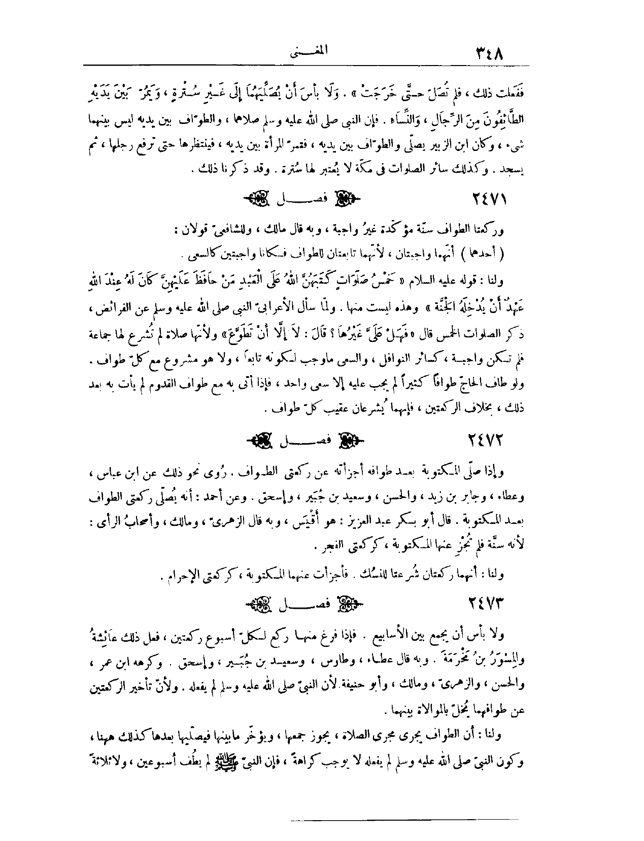 (٢٤٧٢) فَصْلٌ: وَرَكْعَتَا الطَّوَافِ سُنَّةٌ مُؤَكَّدَةٌ غَيْرُ وَاجِبَةٍ. وَبِهِ قَالَ مَالِكٌ. وَلِلشَّافِعِي قَوْلَانِ؛ أَحَدُهُمَا، أَنَّهُمَا وَاجِبَتَانِ؛ لِأَنَّهُمَا تَابِعَتَانِ لِلطَّوَافِ، فَكَانَتَا وَاجِبَتَيْنِ، كَالسَّعْيِ.
