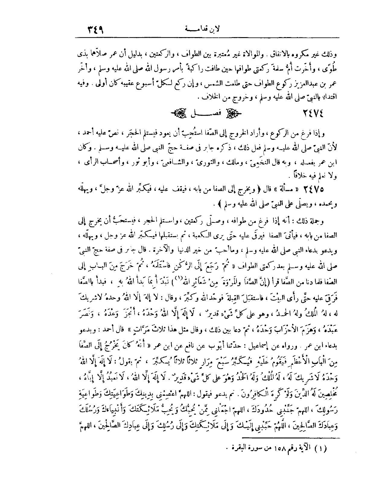 وَإِنْ رَكَعَ لِكُلِّ أُسْبُوعٍ عَقِيبَهُ كَانَ أَوْلَى، وَفِيهِ اقْتِدَاءٌ بِالنَّبِيِّ - صَلَّى اللَّهُ عَلَيْهِ وَسَلَّمَ - وَخُرُوجٌ مِنْ الْخِلَافِ (٢٤٧٥) فَصْلٌ: وَإِذَا فَرَغَ مِنْ الرُّكُوعِ، وَأَرَادَ الْخُرُوجَ إلَى الصَّفَا، اُسْتُحِبَّ أَنْ يَعُودَ فَيَسْتَلِمَ الْحَجَرَ. نَصَّ عَلَيْهِ أَحْمَدُ؛ لِأَنَّ النَّبِيَّ - صَلَّى اللَّهُ عَلَيْهِ وَسَلَّمَ - فَعَلَ ذَلِكَ. ذَكَرَهُ جَابِرٌ فِي صِفَةِ حَجِّ النَّبِيِّ - صَلَّى اللَّهُ عَلَيْهِ وَسَلَّمَ - وَكَانَ ابْنُ عُمَرَ يَفْعَلُهُ. وَبِهِ قَالَ النَّخَعِيُّ، وَمَالِكٌ، وَالثَّوْرِيُّ، وَالشَّافِعِيُّ، وَأَبُو ثَوْرٍ، وَأَصْحَابُ الرَّأْيِ. وَلَا نَعْلَمُ فِيهِ خِلَافًا.