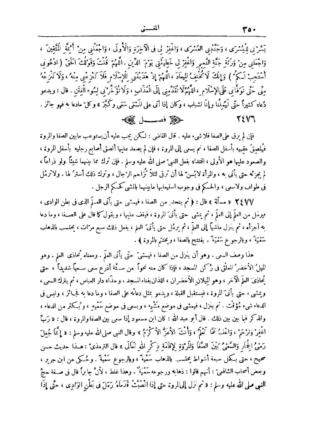 (٢٤٧٨) مَسْأَلَةٌ: قَالَ: (ثُمَّ يَنْحَدِرُ مِنْ الصَّفَا، فَيَمْشِي حَتَّى يَأْتِيَ الْعَلَمَ الَّذِي فِي بَطْنِ الْوَادِي، فَيَرْمُلَ مِنْ الْعَلَمِ إلَى الْعَلَمِ، ثُمَّ يَمْشِي حَتَّى يَأْتِيَ الْمَرْوَةَ، فَيَقِفَ عَلَيْهَا، وَيَقُولَ كَمَا قَالَ عَلَى الصَّفَا، وَمَا دَعَا بِهِ أَجْزَأَهُ، ثُمَّ يَنْزِلُ مَاشِيًا إلَى الْعَلَمِ، ثُمَّ يَرْمُلُ حَتَّى يَأْتِيَ الْعَلَمَ، يَفْعَلُ ذَلِكَ سَبْعَ مَرَّاتٍ، يَحْتَسِبُ بِالذَّهَابِ سَعْيَةً، وَبِالرُّجُوعِ سَعْيَةً، يَفْتَتِحُ بِالصَّفَا وَيَخْتَتِمُ بِالْمَرْوَةِ) هَذَا وَصْفُ السَّعْيِ، وَهُوَ أَنْ يَنْزِلَ مِنْ الصَّفَا، فَيَمْشِيَ حَتَّى يَأْتِيَ الْعَلَمَ.