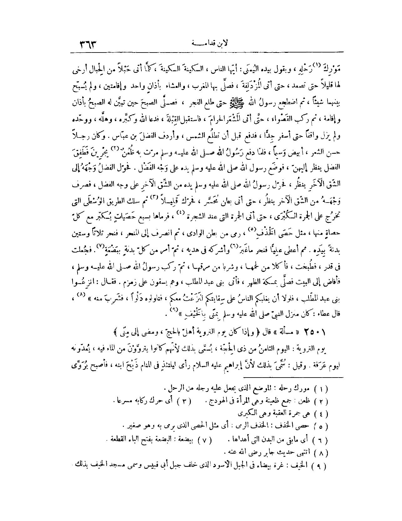 (٢٥٠٢) مَسْأَلَةٌ: قَالَ: (وَإِذَا كَانَ يَوْمُ التَّرْوِيَةِ، أَهَلَّ بِالْحَجِّ، وَمَضَى إلَى مِنًى) يَوْمُ التَّرْوِيَةِ: الْيَوْمُ الثَّامِنُ مِنْ ذِي الْحِجَّةِ. سُمِّيَ بِذَلِكَ لِأَنَّهُمْ كَانُوا يَتَرَوَّوْنَ مِنْ الْمَاءِ فِيهِ، يُعِدُّونَهُ لِيَوْمِ عَرَفَةَ. وَقِيلَ: سُمِّيَ بِذَلِكَ؛ لِأَنَّ إبْرَاهِيمَ - عَلَيْهِ السَّلَامُ - رَأَى لَيْلَتئِذٍ فِي الْمَنَامِ ذَبْحَ ابْنِهِ، فَأَصْبَحَ يَرْوِي