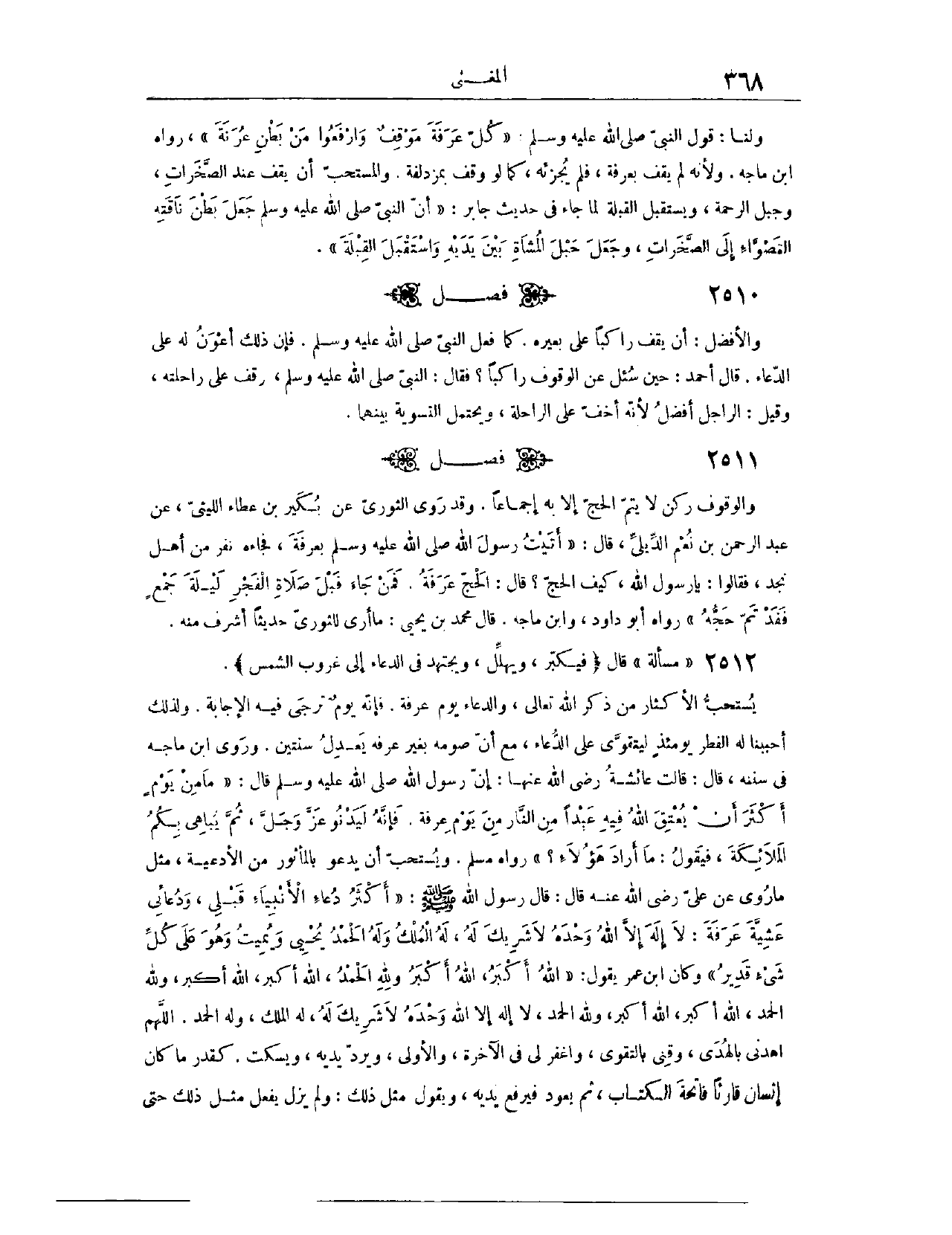 (٢٥١١) فَصْلٌ: وَالْأَفْضَلُ، أَنْ يَقِفَ رَاكِبًا عَلَى بَعِيرِهِ، كَمَا فَعَلَ النَّبِيُّ - صَلَّى اللَّهُ عَلَيْهِ وَسَلَّمَ - فَإِنَّ ذَلِكَ أَعْوَنُ لَهُ عَلَى الدُّعَاءِ. قَالَ أَحْمَدُ، حِينَ سُئِلَ عَنْ الْوُقُوفِ رَاكِبًا، فَقَالَ: النَّبِيُّ - صَلَّى اللَّهُ عَلَيْهِ وَسَلَّمَ - وَقَفَ عَلَى رَاحِلَتِهِ. وَقِيلَ: الرَّاجِلُ أَفْضَلُ؛ لِأَنَّهُ أَخَفُّ عَلَى الرَّاحِلَةِ. وَيَحْتَمِلُ التَّسْوِيَةَ بَيْنَهُمَا. (٢٥١٢) فَصْلٌ: وَالْوُقُوفُ رُكْنٌ، لَا يَتِمُّ الْحَجُّ إلَّا بِهِ، إجْمَاعًا.