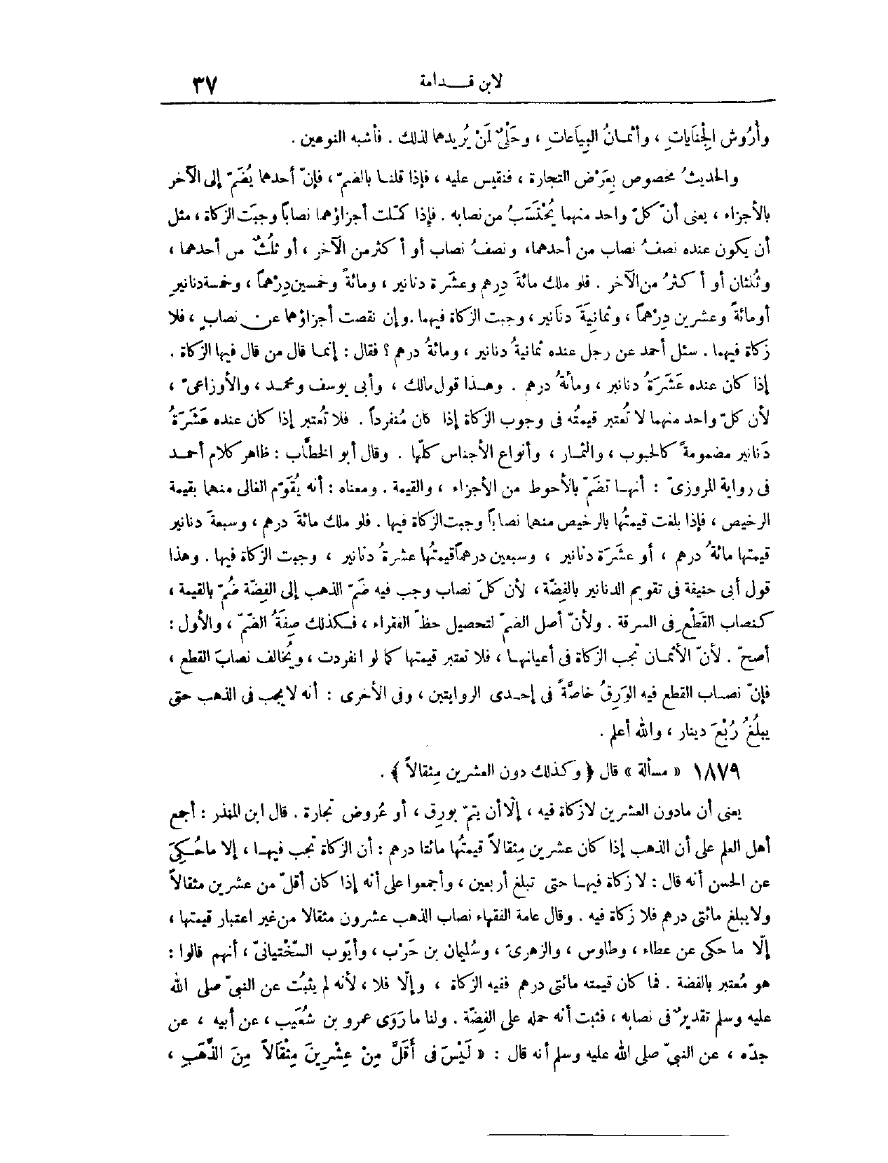 (١٨٧٩) مَسْأَلَةٌ: قَالَ: (وَكَذَلِكَ دُونَ الْعِشْرِينَ مِثْقَالًا) يَعْنِي أَنَّ مَا دُونَ الْعِشْرِينَ لَا زَكَاةَ فِيهِ إلَّا أَنْ يَتِمَّ بِوَرِقٍ أَوْ عُرُوضِ تِجَارَةٍ. قَالَ ابْنُ الْمُنْذِرِ: أَجْمَعَ أَهْلُ الْعِلْمِ عَلَى أَنَّ الذَّهَبَ إذَا كَانَ عِشْرِينَ مِثْقَالًا قِيمَتُهَا مِائَتَا دِرْهَمٍ، أَنَّ الزَّكَاةَ تَجِبُ فِيهَا، إلَّا مَا حُكِيَ عَنْ الْحَسَنِ أَنَّهُ قَالَ: لَا زَكَاةَ فِيهَا حَتَّى تَبْلُغَ أَرْبَعِينَ، وَأَجْمَعُوا عَلَى أَنَّهُ إذَا كَانَ أَقَلَّ مِنْ عِشْرِينَ مِثْقَالًا وَلَا يَبْلُغُ مِائَتَيْ دِرْهَمٍ فَلَا زَكَاةَ فِيهِ.