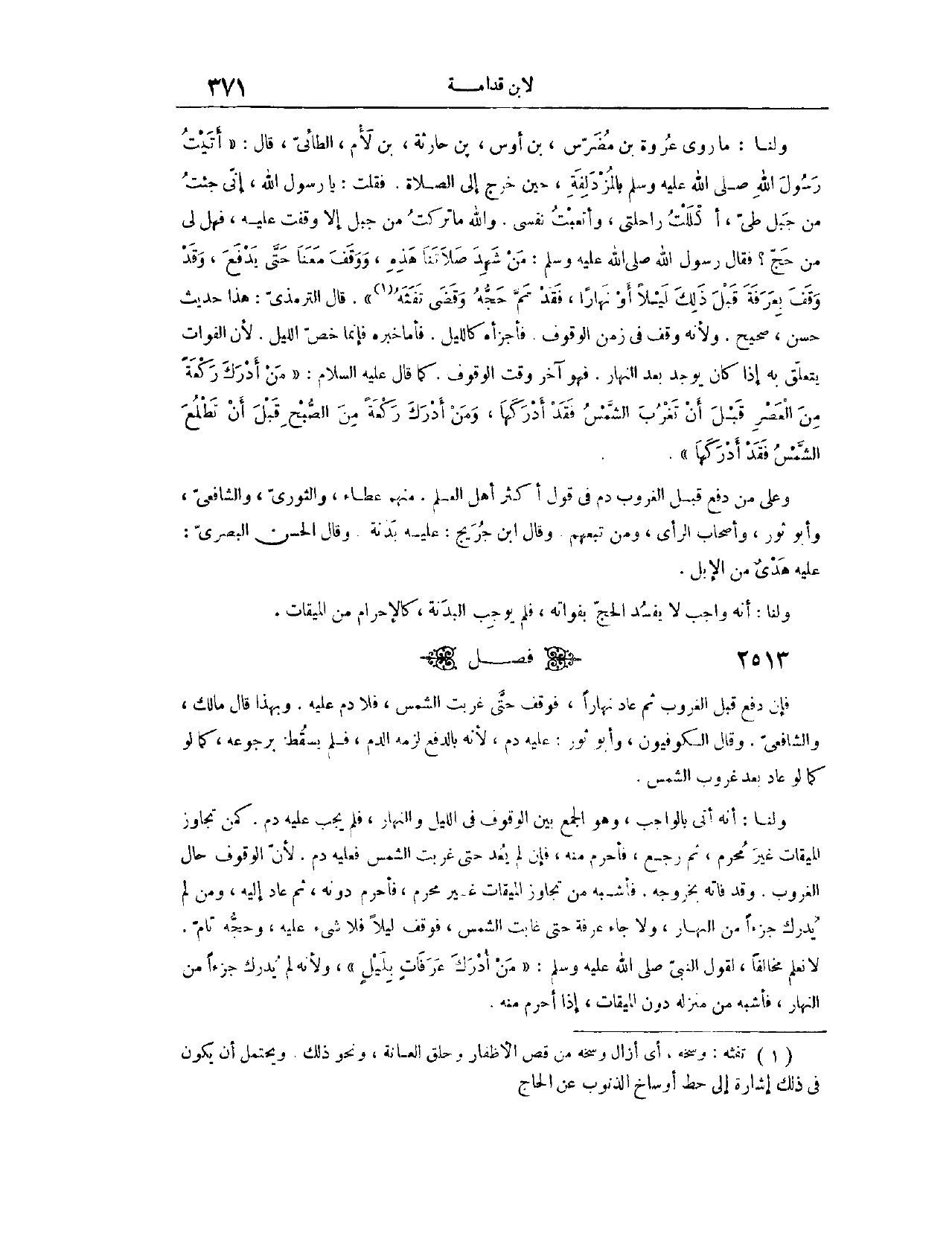 وَلَنَا، مَا رَوَى عُرْوَةُ بْنُ مُضَرِّسِ بْنِ أَوْسِ بْنِ حَارِثَةَ بْنِ لَامٍ الطَّائِيِّ، قَالَ: «أَتَيْت رَسُولَ اللَّهِ - صَلَّى اللَّهُ عَلَيْهِ وَسَلَّمَ - بِالْمُزْدَلِفَةِ، حِينَ خَرَجَ إلَى الصَّلَاةِ. فَقُلْت: يَا رَسُولَ اللَّهِ، إنِّي جِئْت مِنْ جَبَلِ طَيٍّ، أَكْلَلْت رَاحِلَتِي، وَأَتْعَبْت نَفْسِي، وَاَللَّهِ مَا تَرَكْت مِنْ جَبَلٍ إلَّا وَقَفْت عَلَيْهِ، فَهَلْ لِي مِنْ حَجٍّ؟ فَقَالَ رَسُولُ اللَّهِ - صَلَّى اللَّهُ عَلَيْهِ وَسَلَّمَ -: مَنْ شَهِدَ صَلَاتَنَا هَذِهِ، وَوَقَفَ مَعَنَا حَتَّى يَدْفَعَ، وَقَدْ وَقَفَ بِعَرَفَةَ قَبْلَ ذَلِكَ لَيْلًا أَوْ نَهَارًا، فَقَدْ تَمَّ حَجُّهُ، وَقَضَى تَفَثَهُ» . قَالَ التِّرْمِذِيُّ: هَذَا حَدِيثٌ حَسَنٌ صَحِيحٌ.