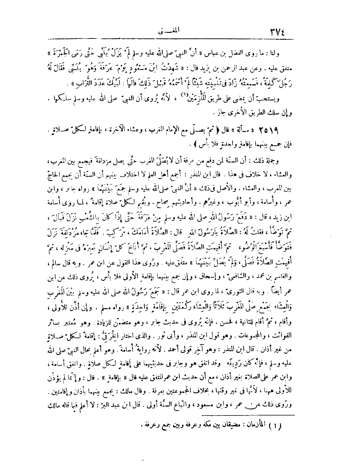 مَسْأَلَةٌ: قَالَ: (ثُمَّ يُصَلِّي مَعَ الْإِمَامِ الْمَغْرِبَ وَعِشَاءَ الْآخِرَةِ، بِإِقَامَةٍ لِكُلِّ صَلَاةٍ. فَإِنْ جَمَعَ بَيْنَهُمَا بِإِقَامَةٍ وَاحِدَةٍ، فَلَا بَأْسَ) وَجُمْلَةُ ذَلِكَ أَنَّ السُّنَّةَ لِمَنْ دَفَعَ مِنْ عَرَفَةَ، أَنْ لَا يُصَلِّيَ الْمَغْرِبَ حَتَّى يَصِلَ مُزْدَلِفَةَ، فَيَجْمَعَ بَيْنَ الْمَغْرِبِ وَالْعِشَاءِ. لَا خِلَافَ فِي هَذَا. قَالَ ابْنُ الْمُنْذِرِ: أَجْمَعَ أَهْلُ الْعِلْمِ لَا اخْتِلَافَ بَيْنَهُمْ، أَنَّ السُّنَّةَ أَنَّ يَجْمَعَ الْحَاجُّ بَيْنَ الْمَغْرِبِ وَالْعِشَاءِ.