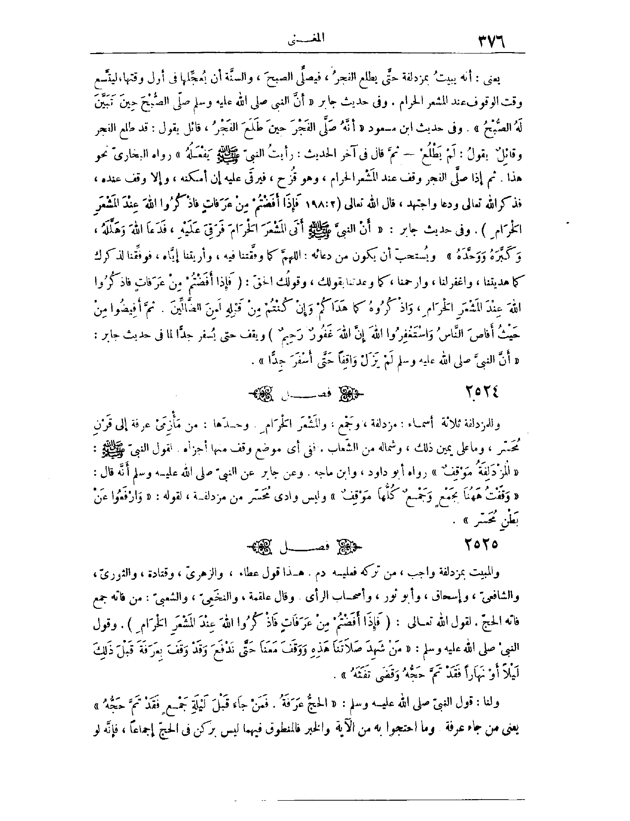 (٢٥٢٥) فَصْلٌ: وَلِلْمُزْدَلِفَةِ ثَلَاثَةُ أَسْمَاءٍ: مُزْدَلِفَةُ، وَجَمْعٌ، وَالْمَشْعَرُ الْحَرَامُ. وَحَدُّهَا مِنْ مَأْزِمَيْ عَرَفَةَ إلَى قَرْنِ مُحَسِّرٍ، وَمَا عَلَى يَمِينِ ذَلِكَ وَشِمَالِهِ مِنْ الشِّعَابِ، فَفِي أَيِّ مَوْضِعٍ وَقَفَ مِنْهَا أَجْزَأَهُ؛ لِقَوْلِ النَّبِيِّ: - صَلَّى اللَّهُ عَلَيْهِ وَسَلَّمَ - «الْمُزْدَلِفَةُ مَوْقِفٌ» . رَوَاهُ أَبُو دَاوُد، وَابْنُ مَاجَهْ.